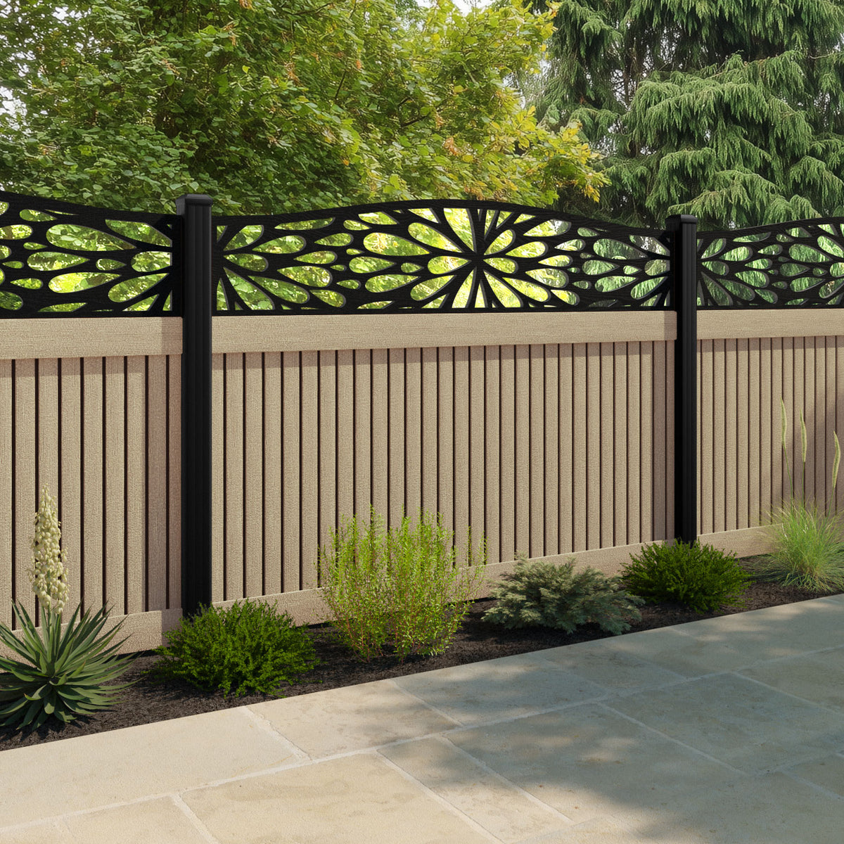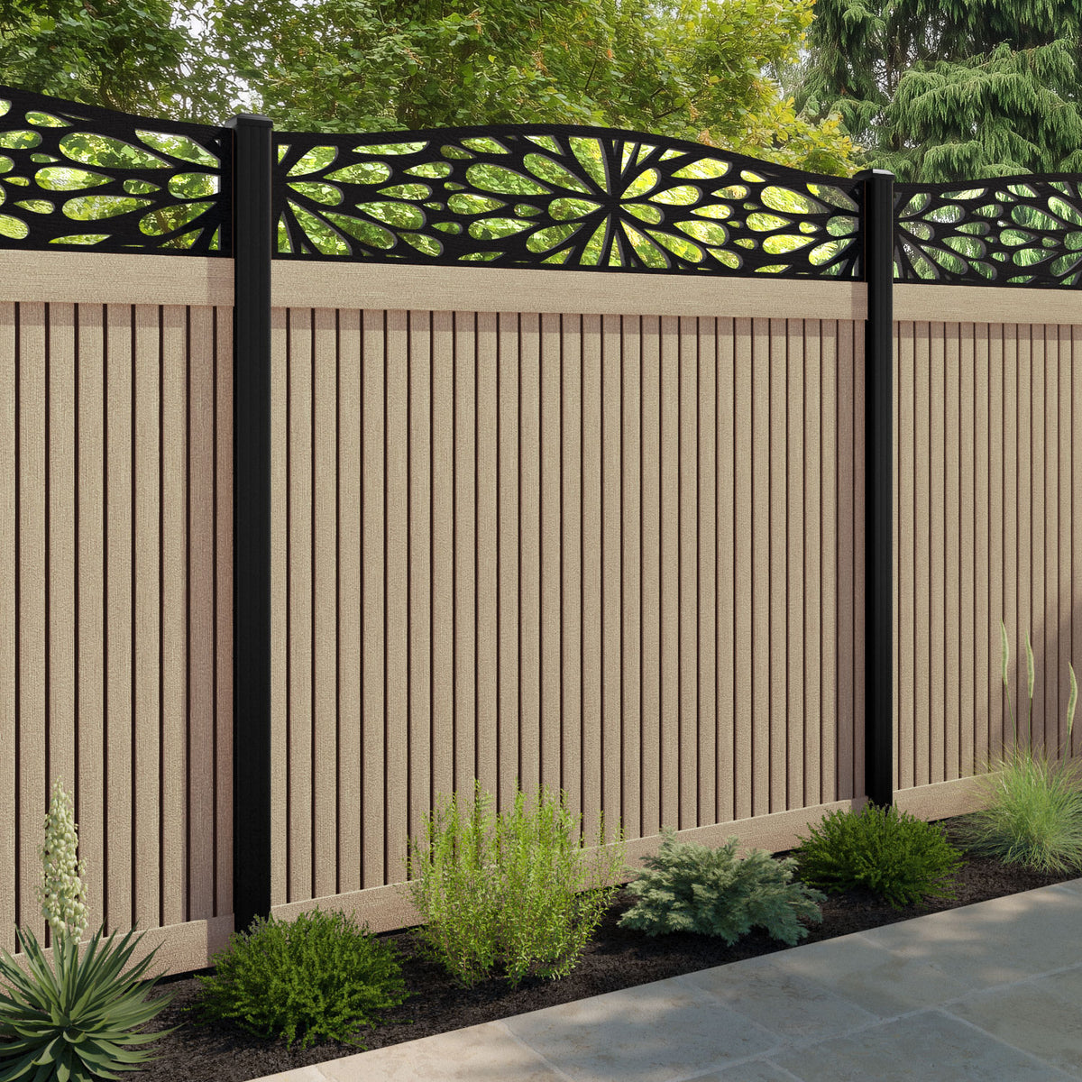 Virtis Blossom Curved Top Fence Panel Light Oak - with our aluminium posts