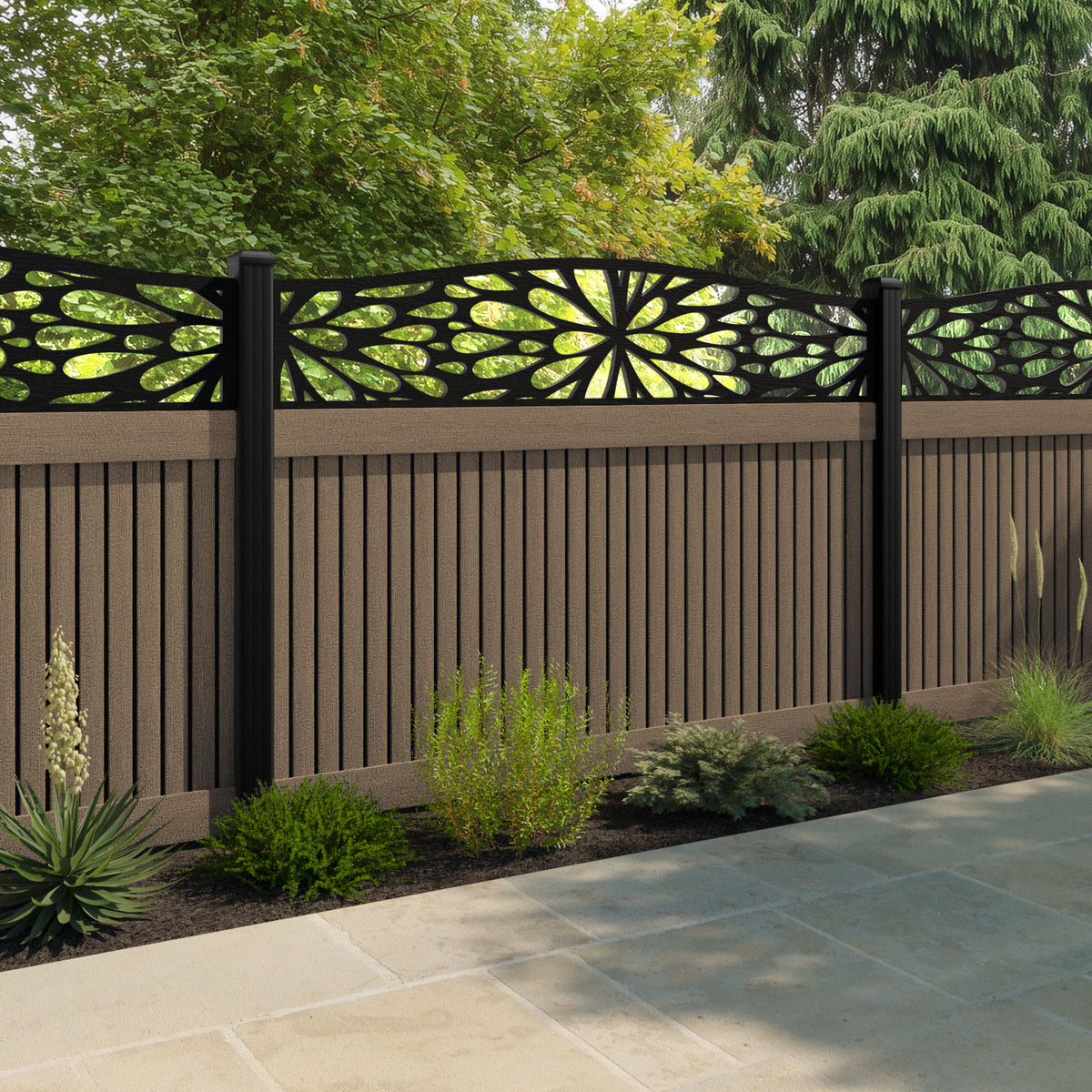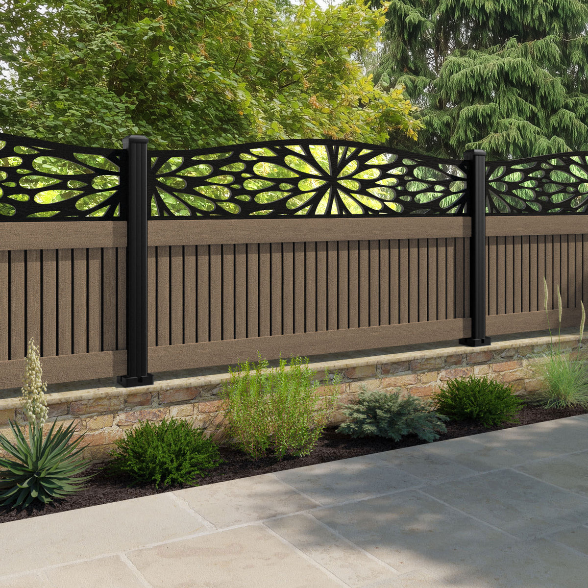 Virtis Blossom Curved Top Fence Panel Teak - with our aluminium posts