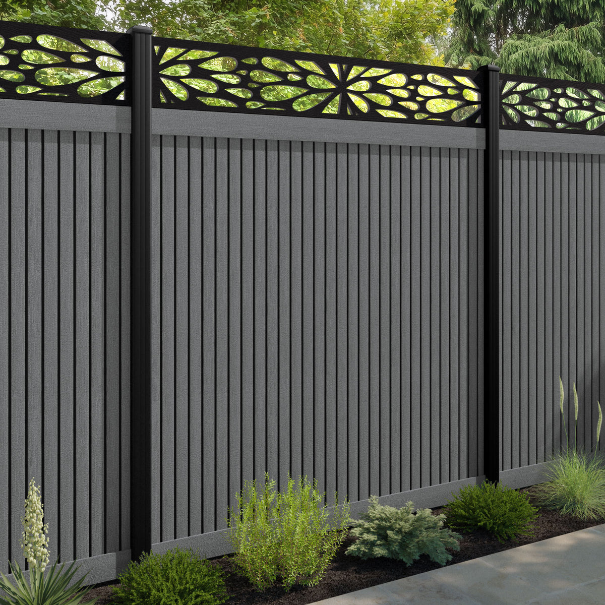 Virtis Blossom Fence Panel Mid Grey - with our aluminium posts