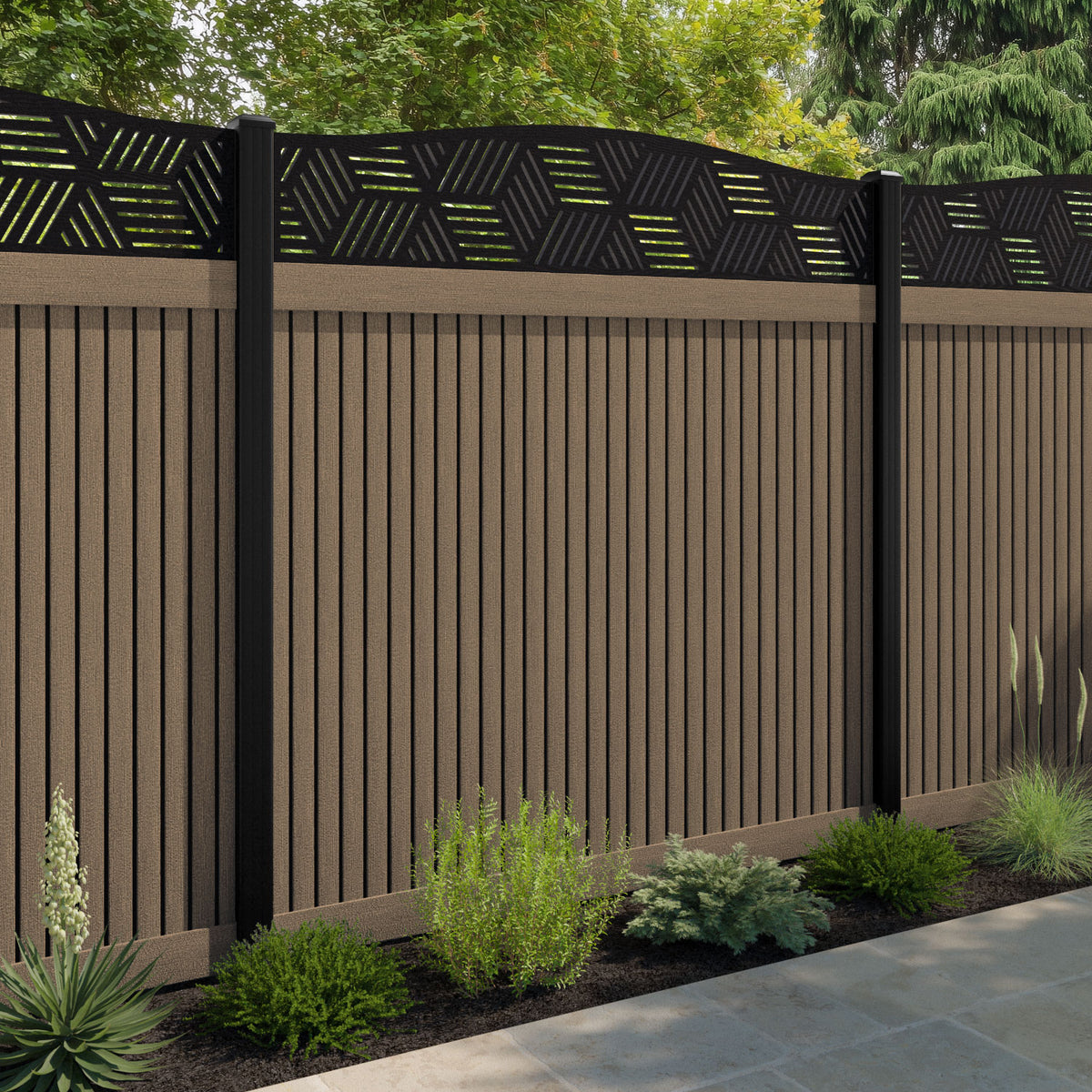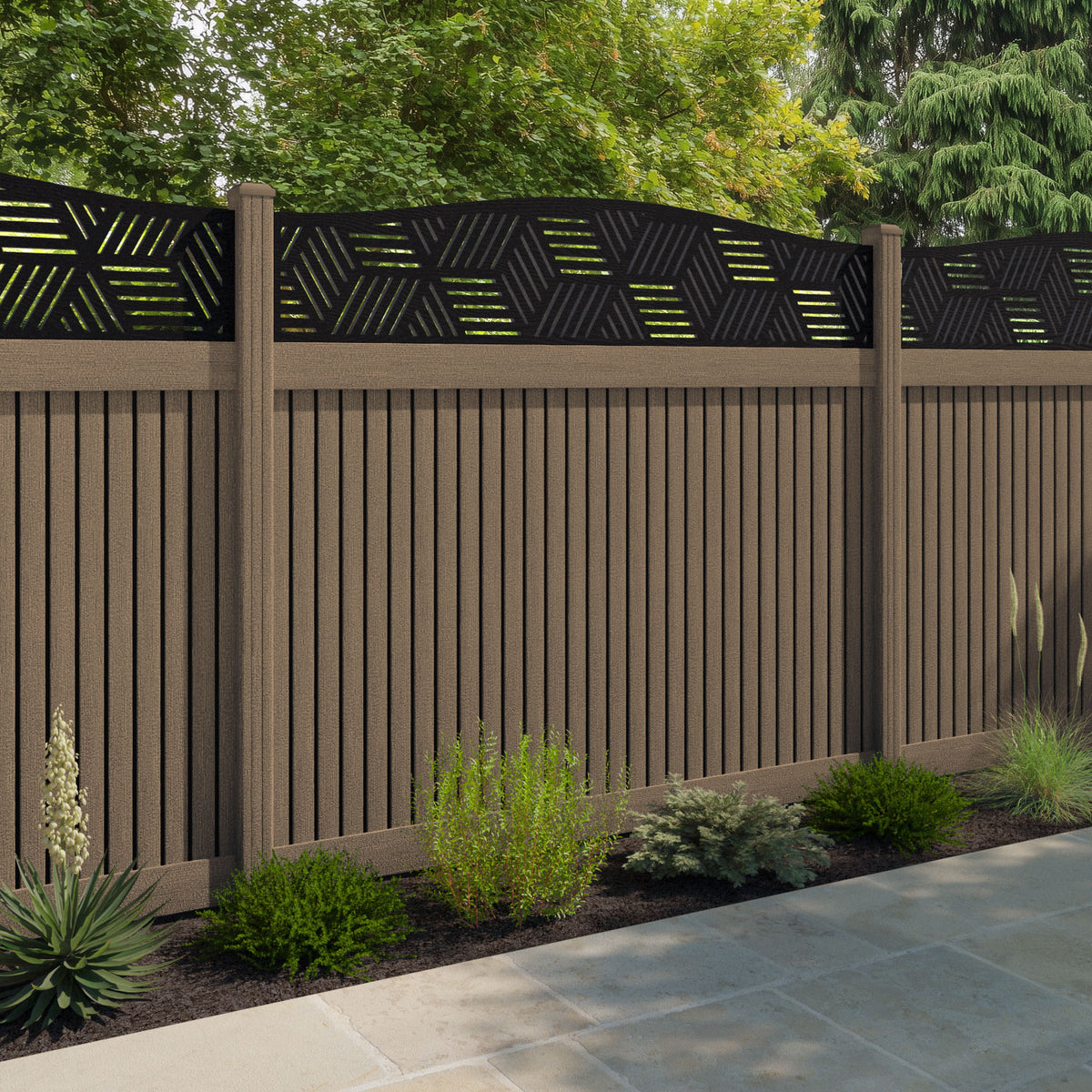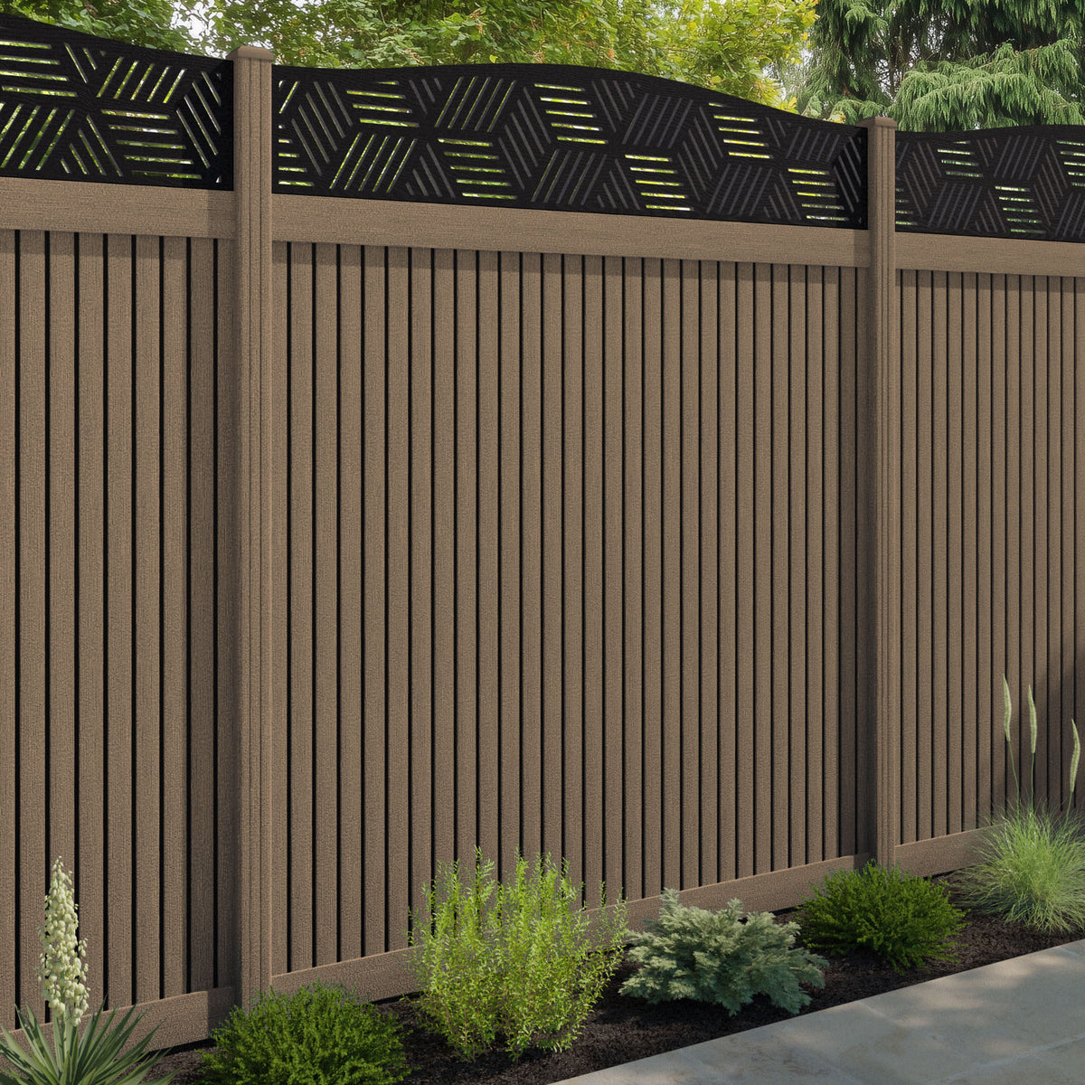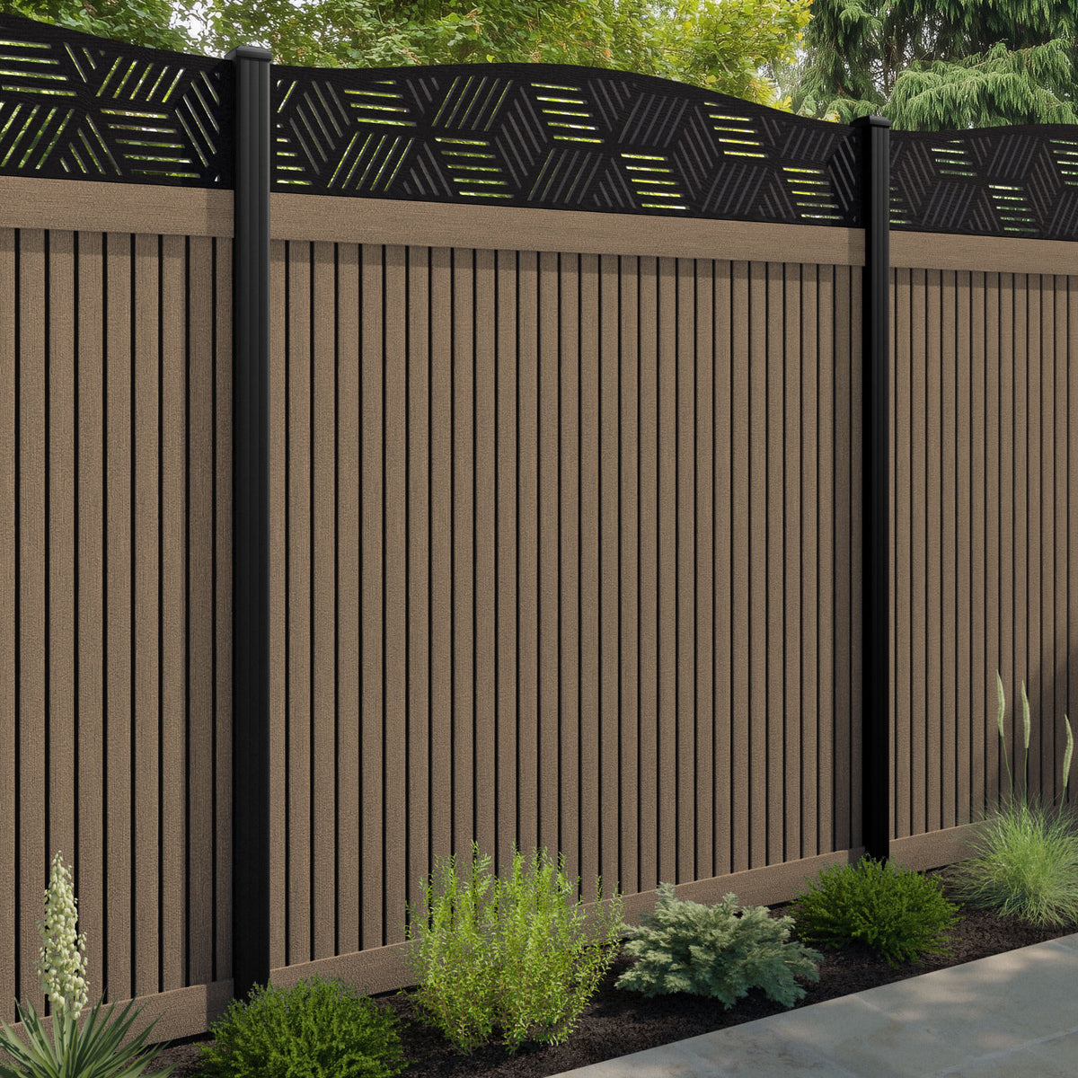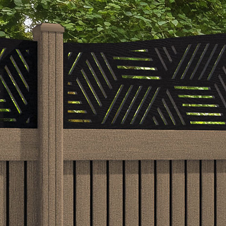 Virtis Cubed Curved Top Fence Panel Teak - with our composite posts