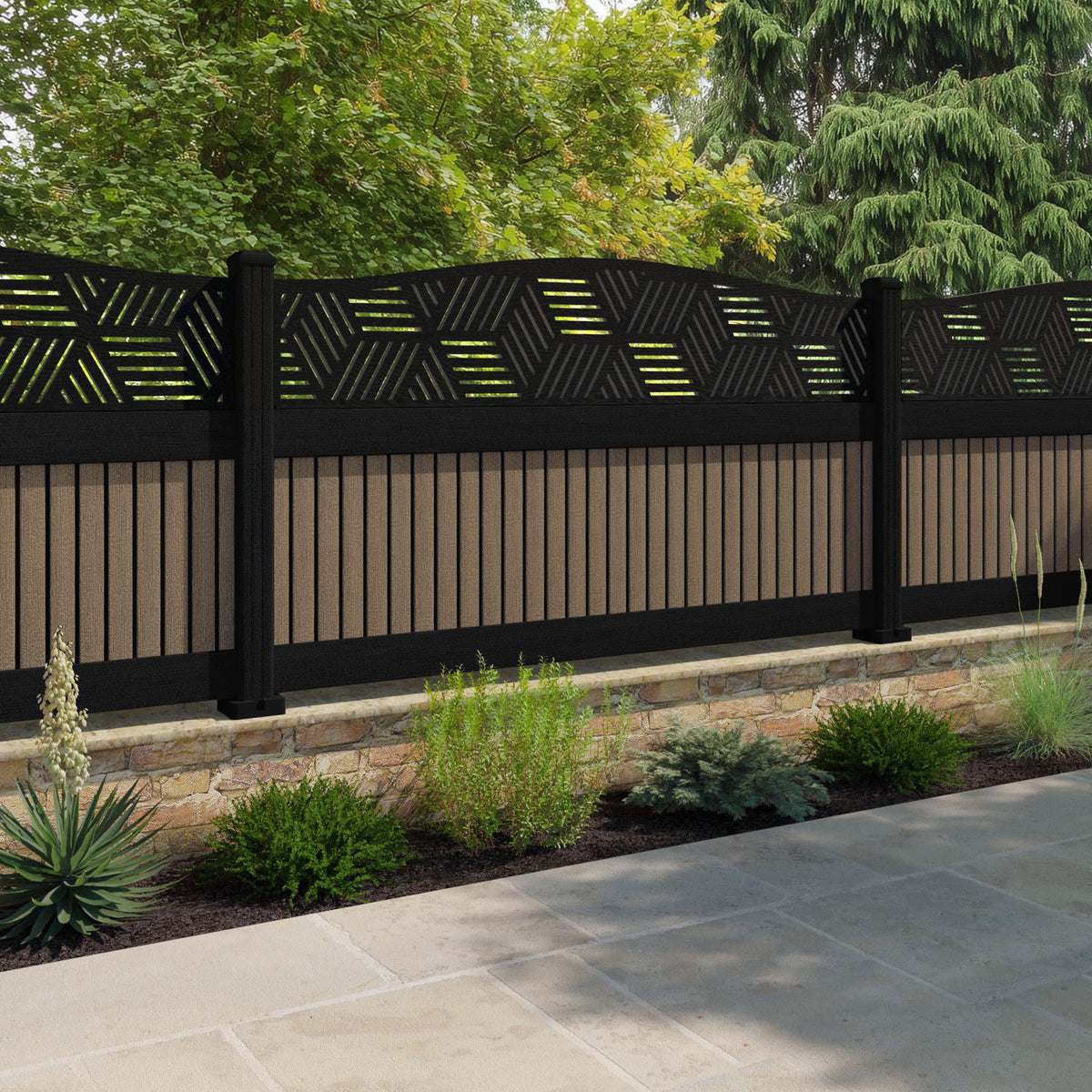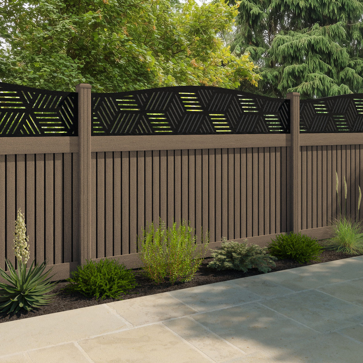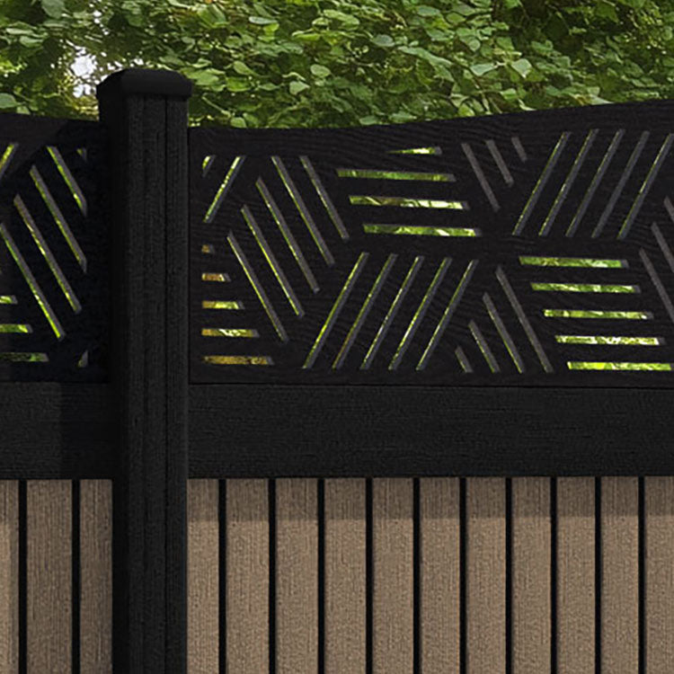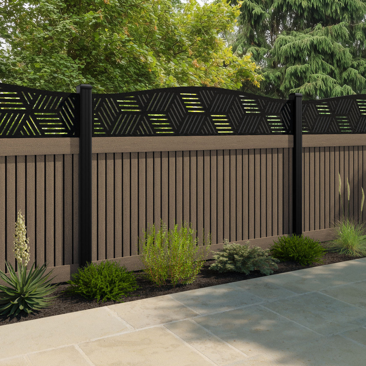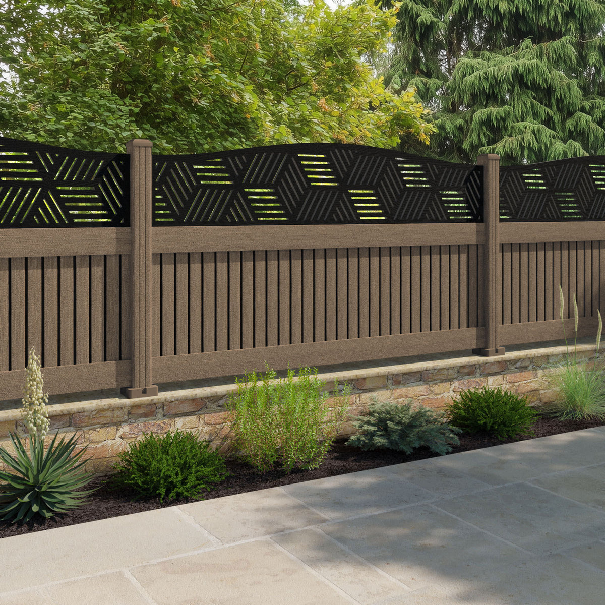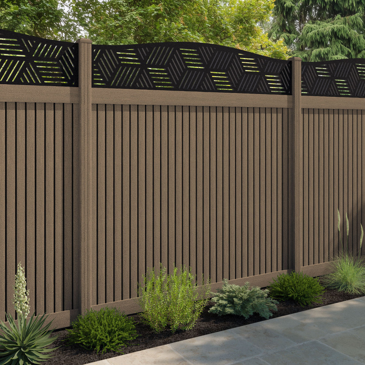 Virtis Cubed Curved Top Fence Panel Teak - with our composite posts