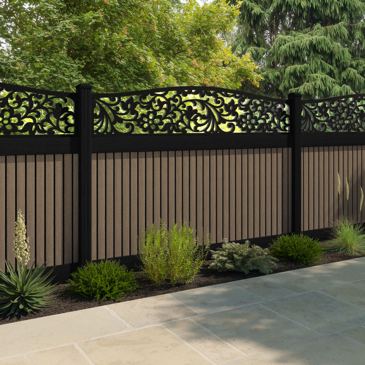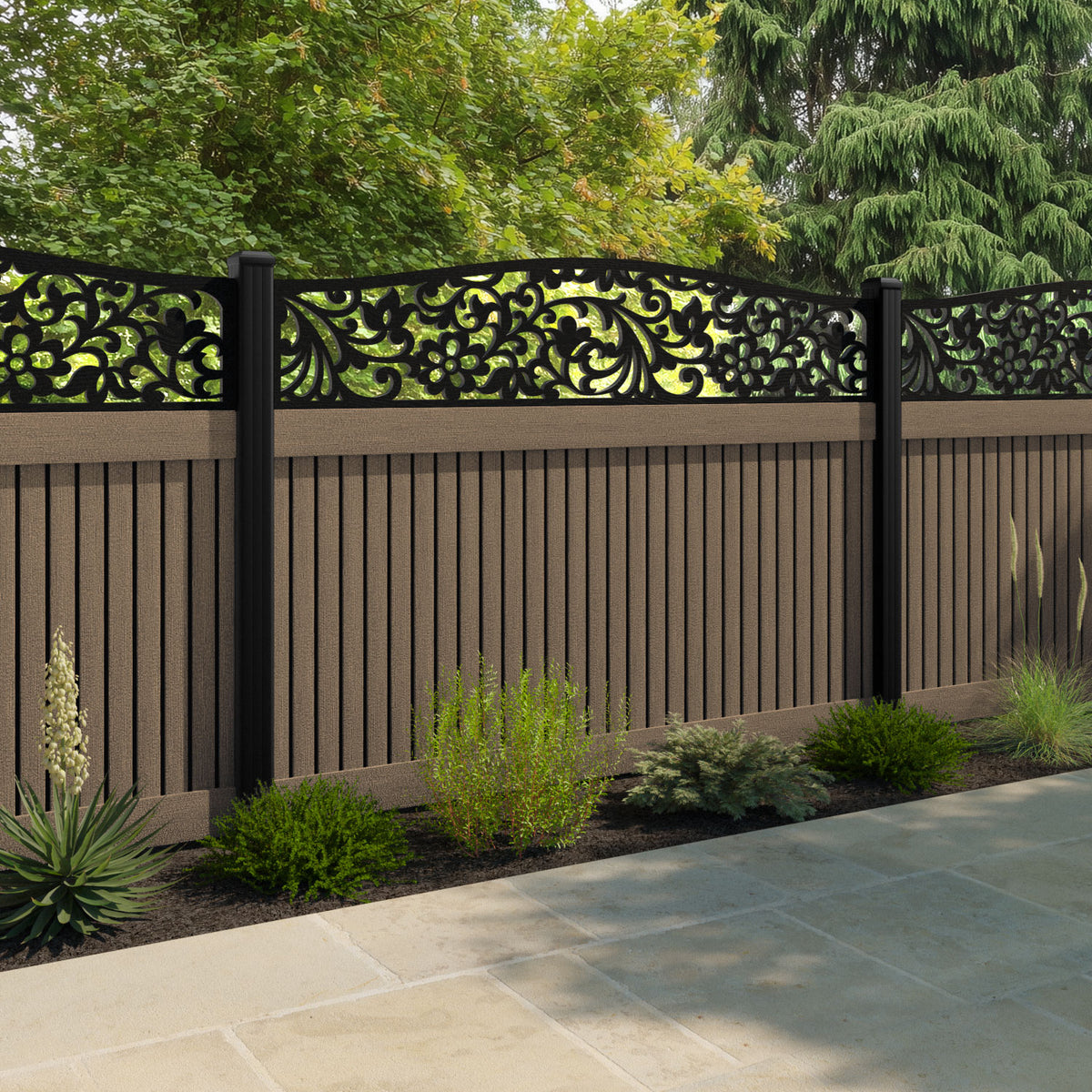 Virtis Eden Curved Top Fence Panel Teak - with our aluminium posts