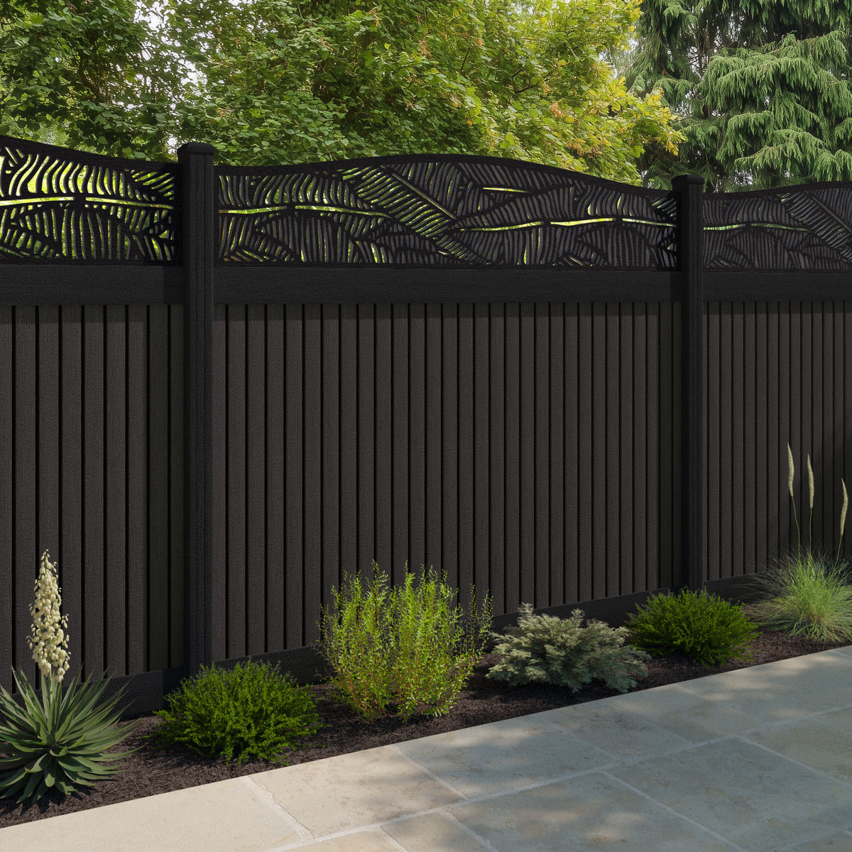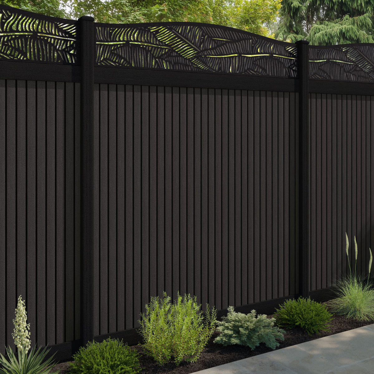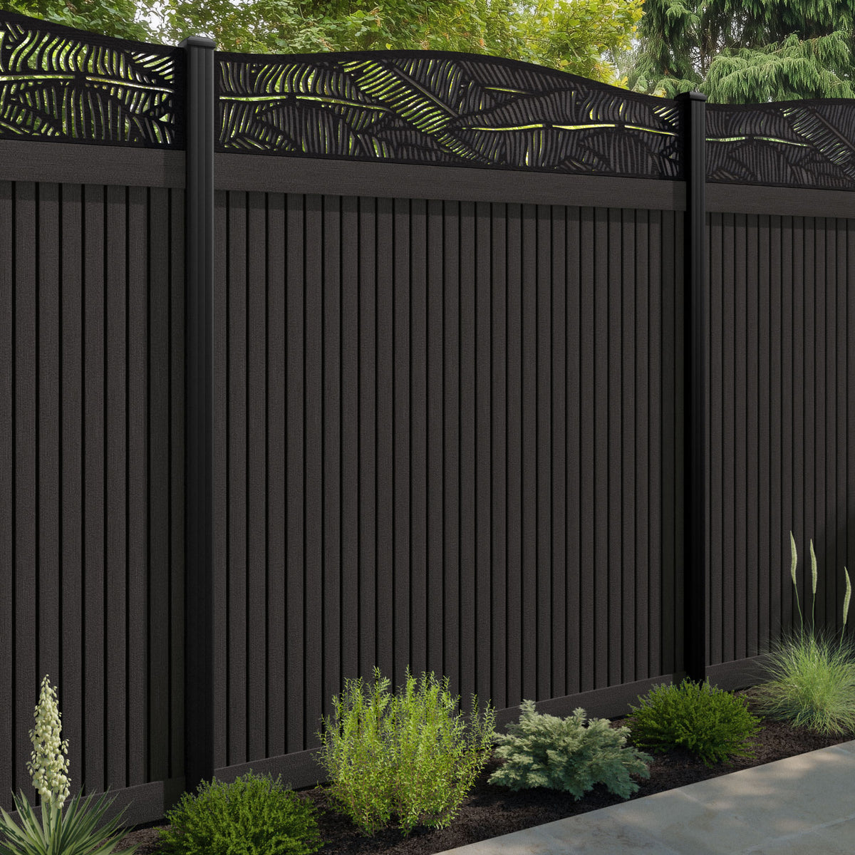 Virtis Feather Curved Top Fence Panel Dark Oak - with our aluminium posts