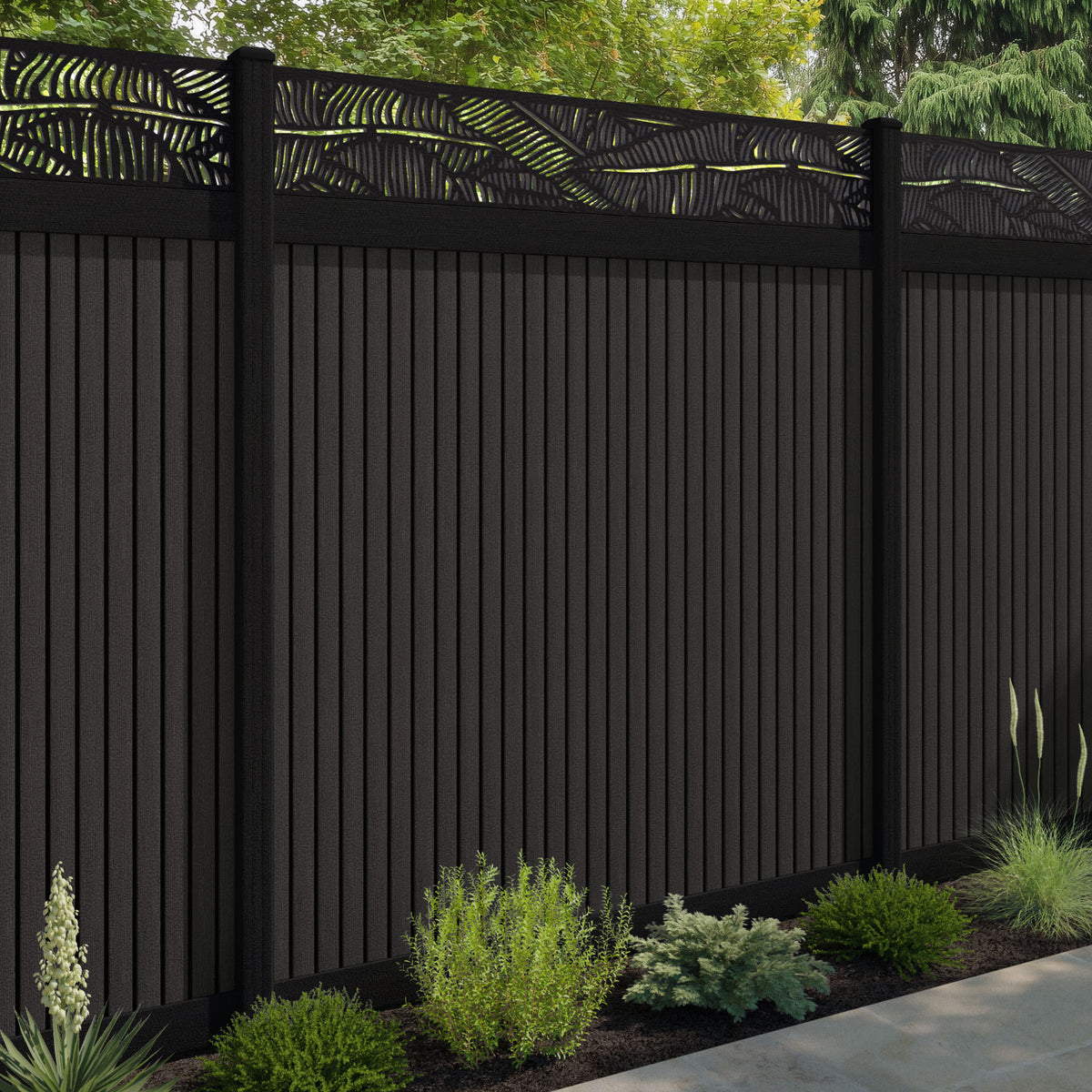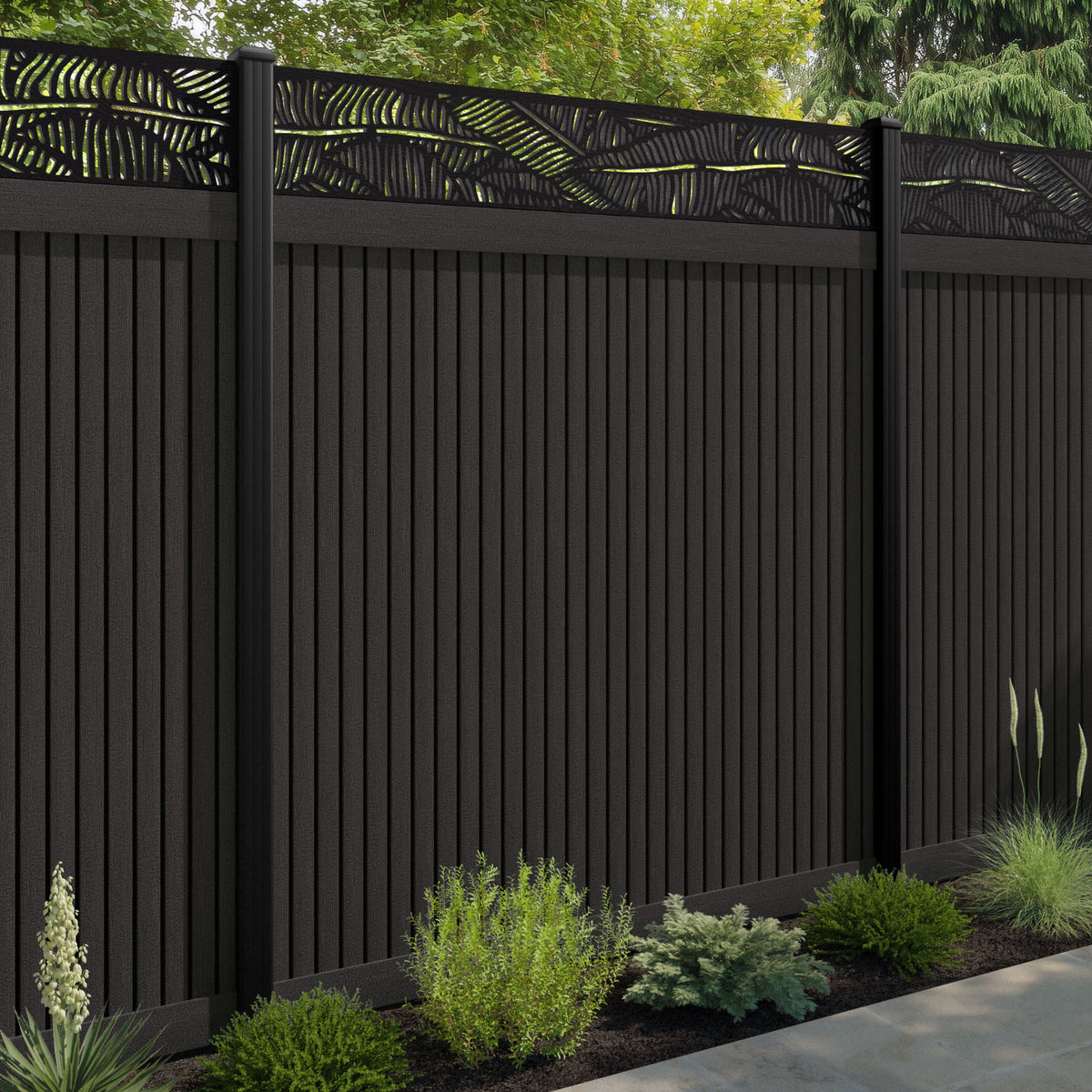 Virtis Feather Fence Panel Dark Oak - with our aluminium posts