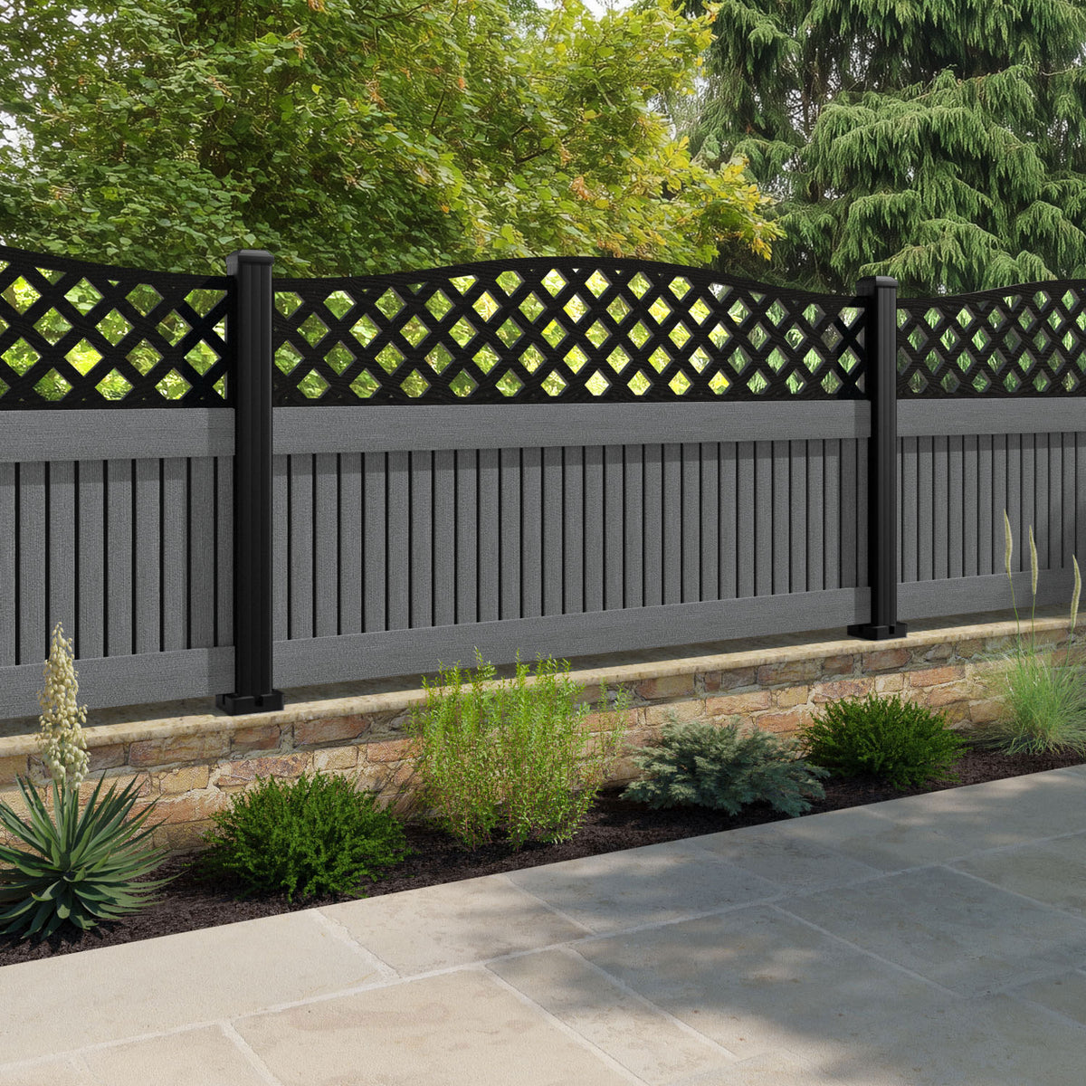 Virtis High Wave Fence Panel Mid Grey - with our aluminium posts