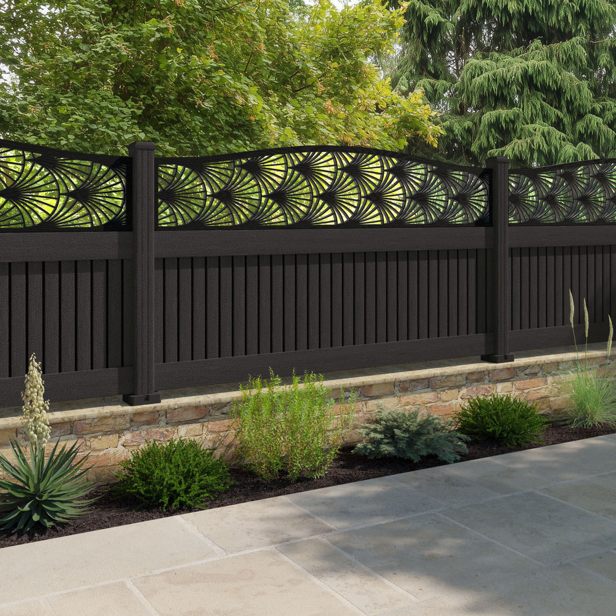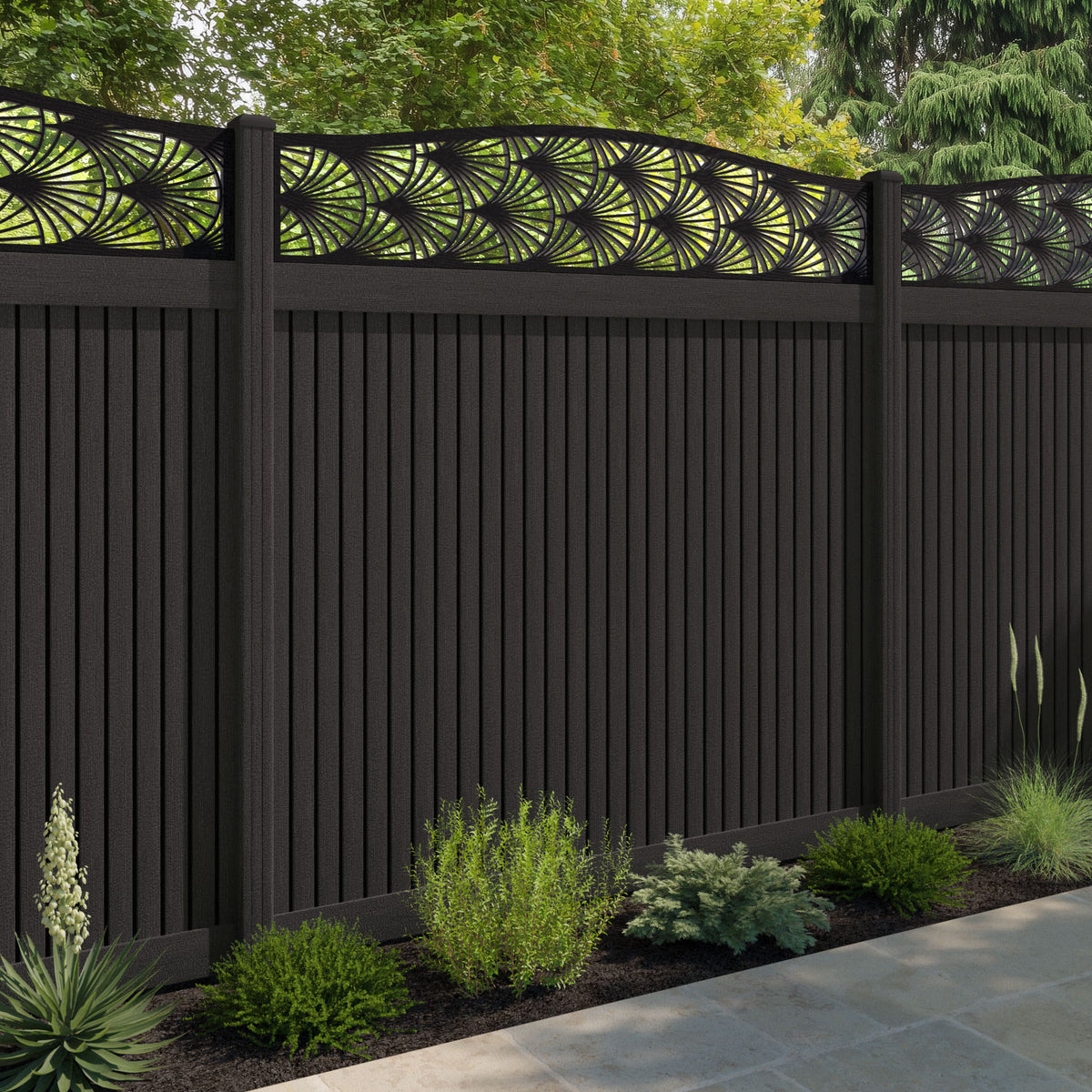 Virtis Laurel Curved Top Fence Panel Dark Oak - with our composite posts