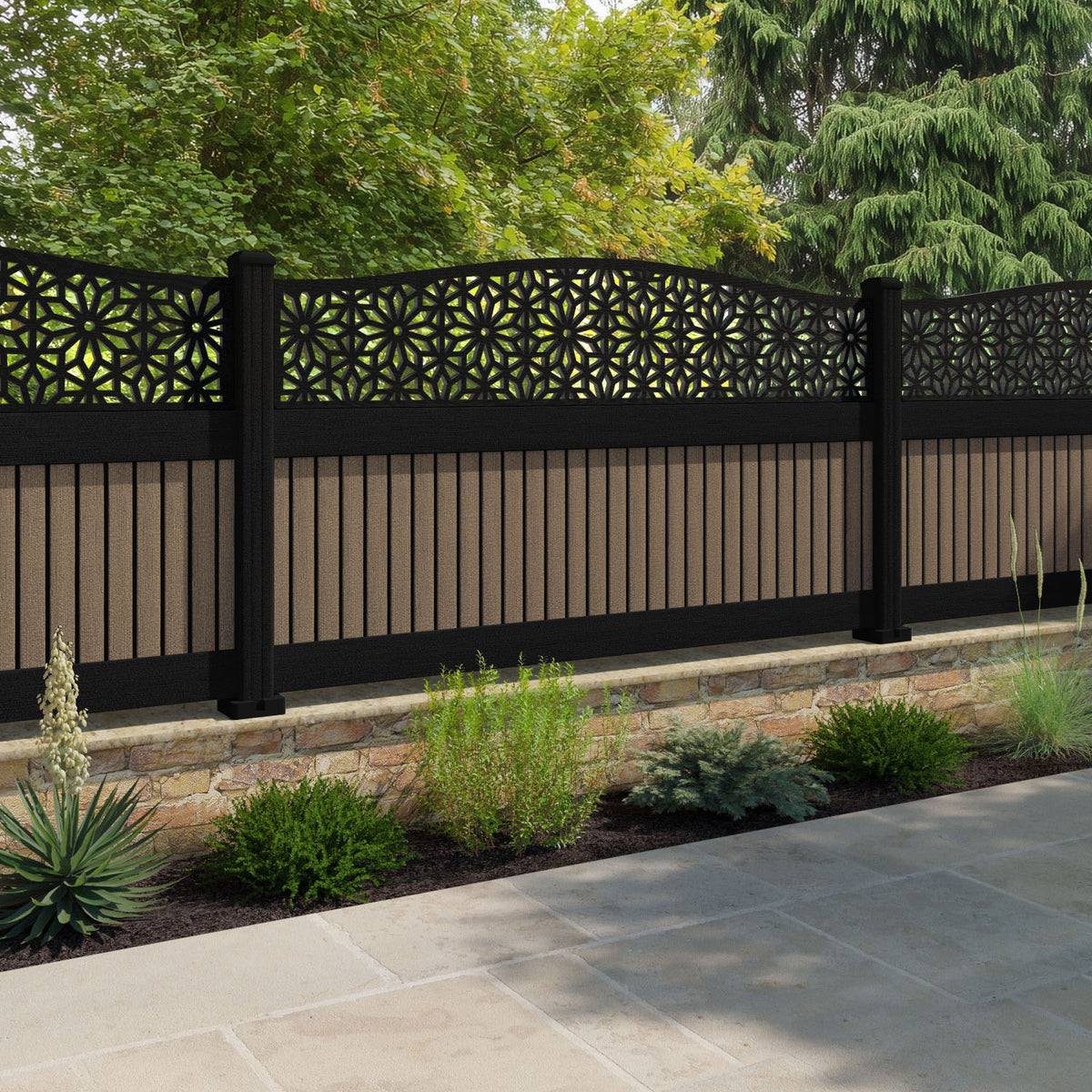 Virtis Narwa Curved Top Fence Panel Teak - with our aluminium posts