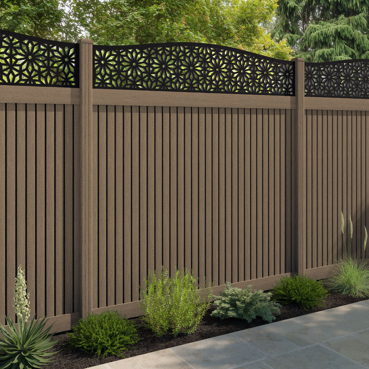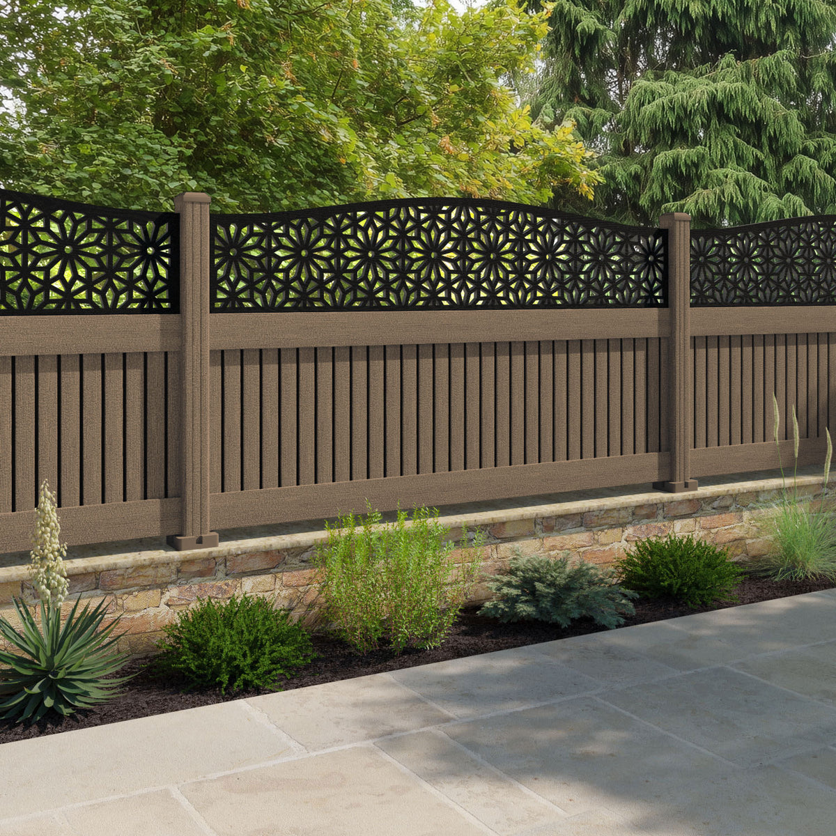 Virtis Narwa Curved Top Fence Panel Teak - with our composite posts