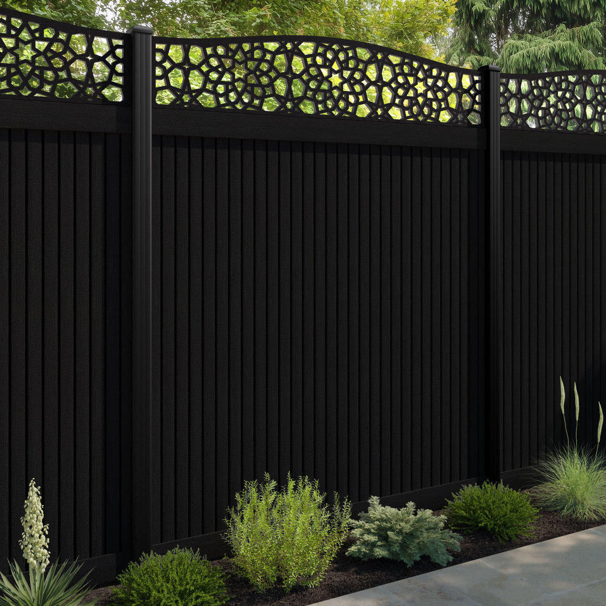 Virtis Nazira Curved Top Fence Panel Black - with our aluminium posts