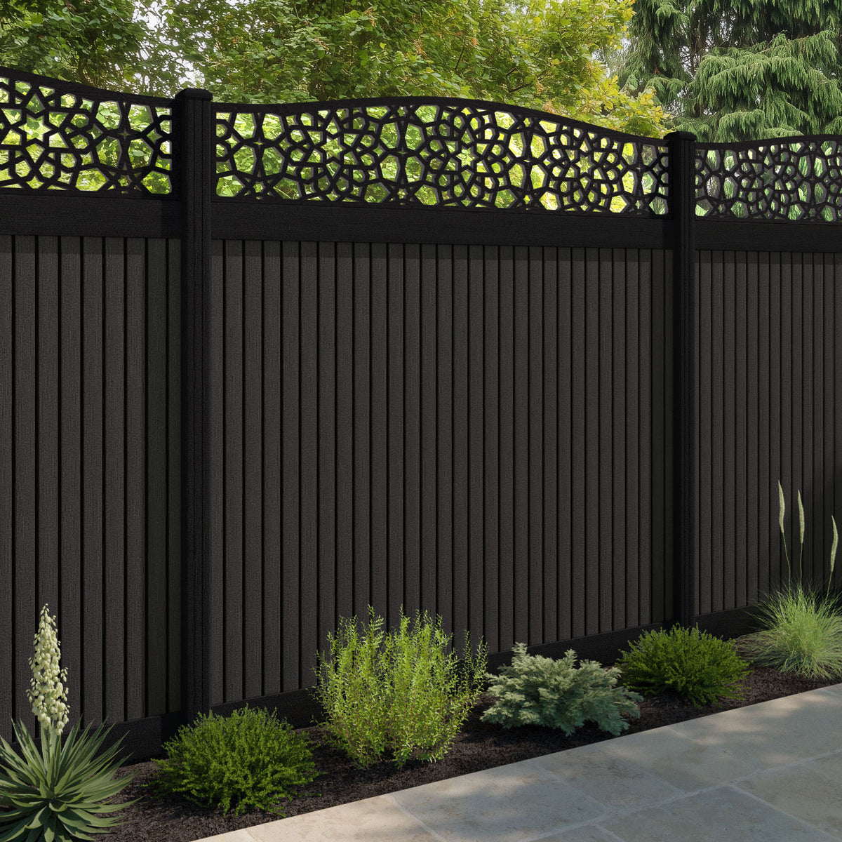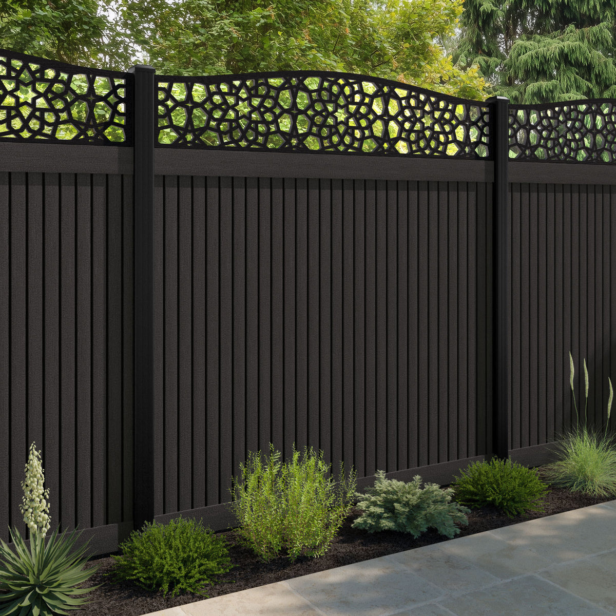Virtis Nazira Curved Top Fence Panel Dark Oak - with our aluminium posts