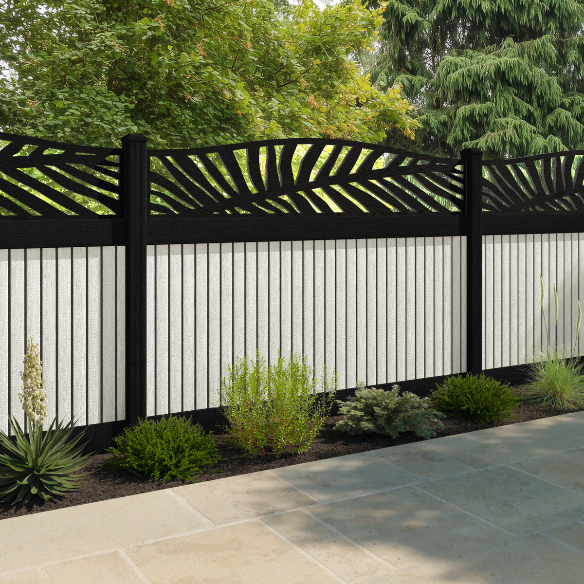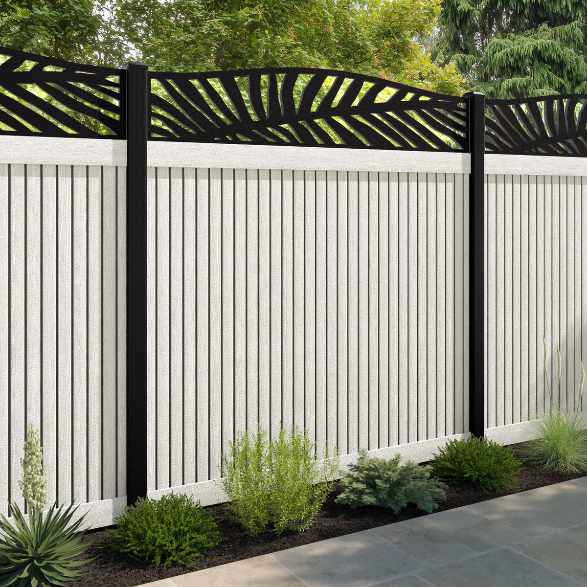 Virtis Palm Curved Top Fence Panel Light Stone - with our aluminium posts