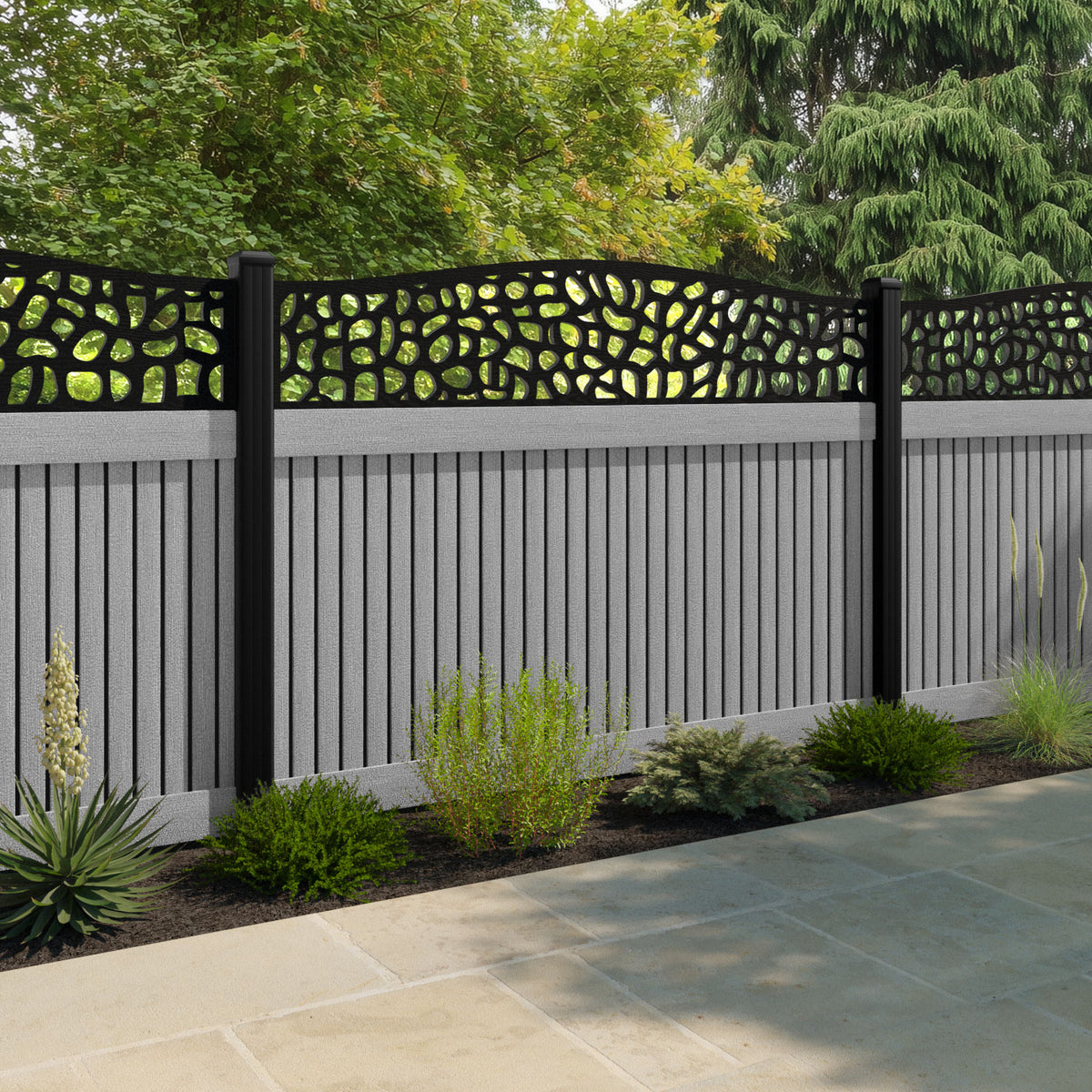 Virtis Pebble Curved Top Fence Panel Light Grey - with our aluminium posts