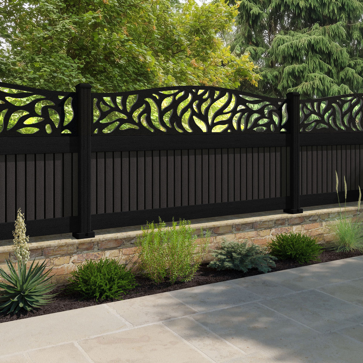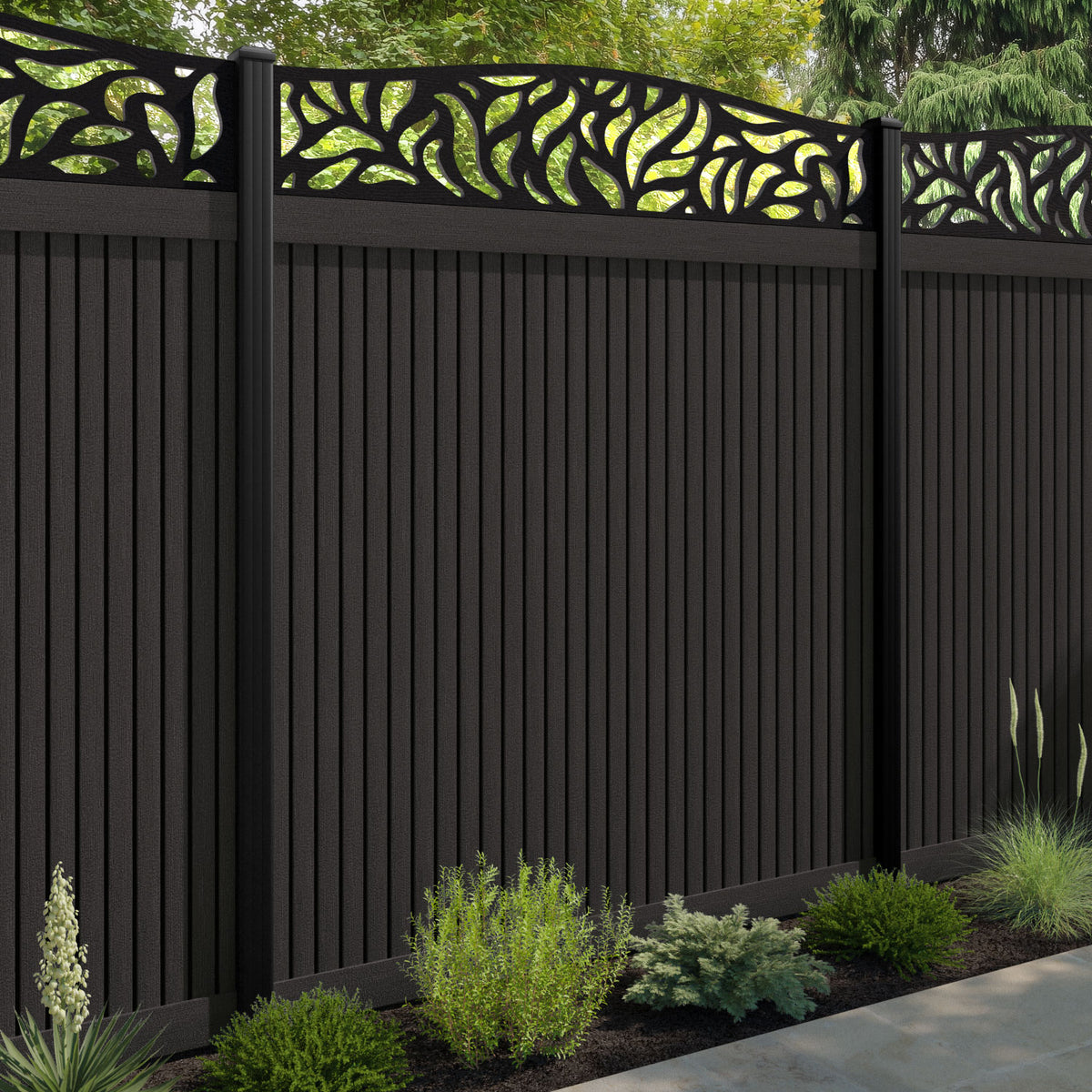 Virtis Plume Curved Top Fence Panel Dark Oak - with our composite posts