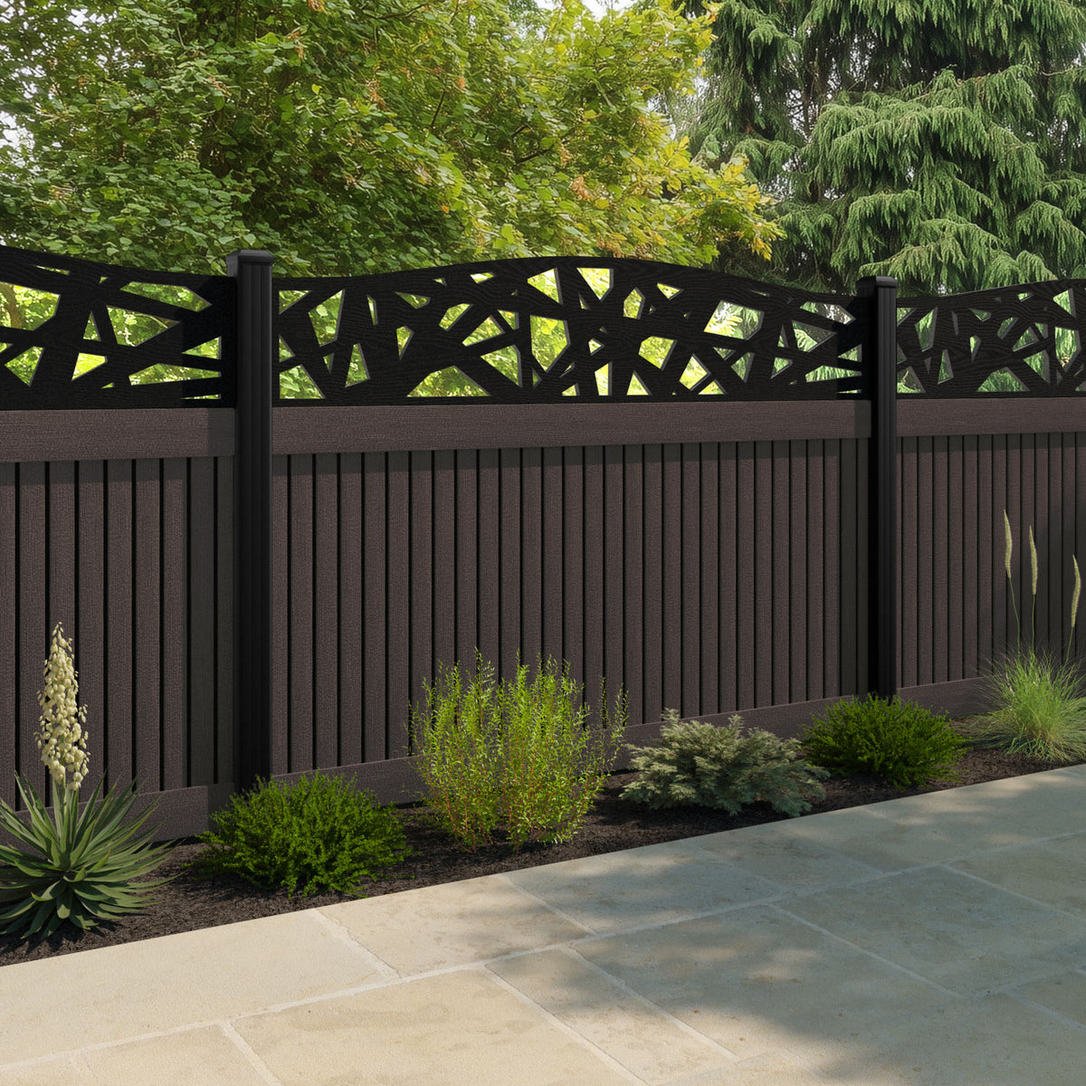 Virtis Prism Curved Top Fence Panel Mid Brown - with our aluminium posts