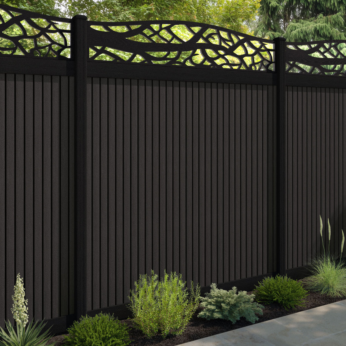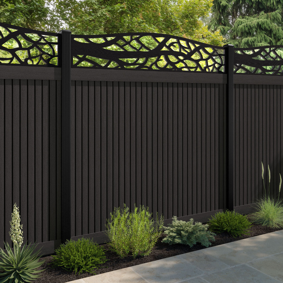Virtis Twilight Curved Top Fence Panel Dark Oak - with our aluminium posts