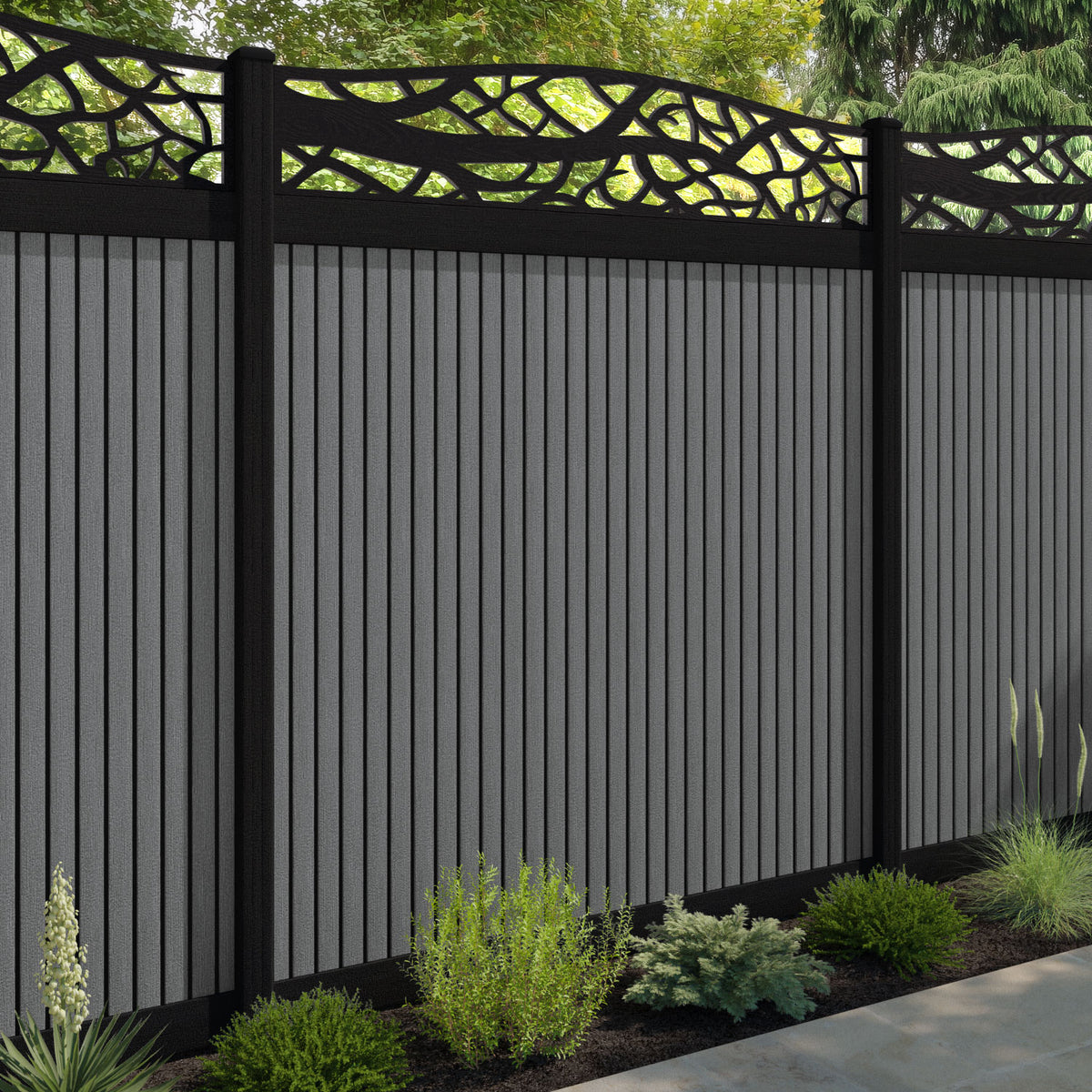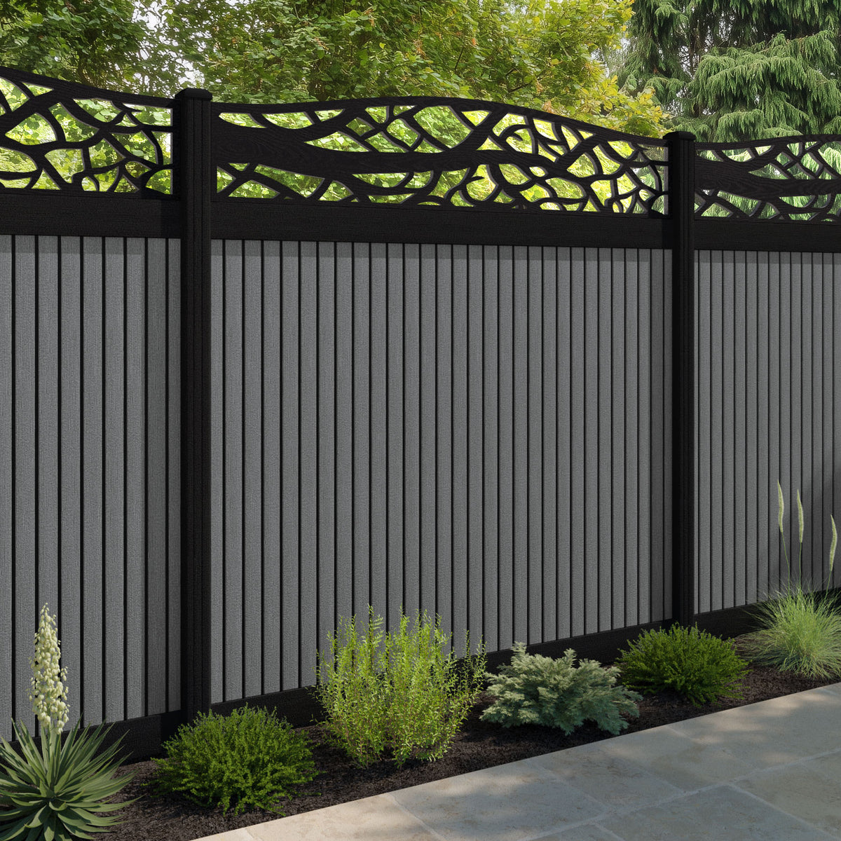 Virtis Twilight Curved Top Fence Panel Mid Grey - with our aluminium posts