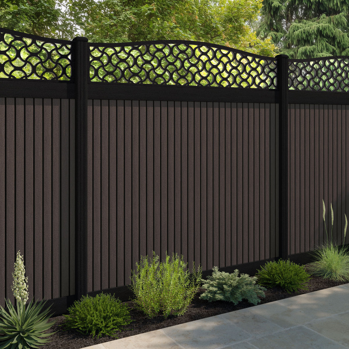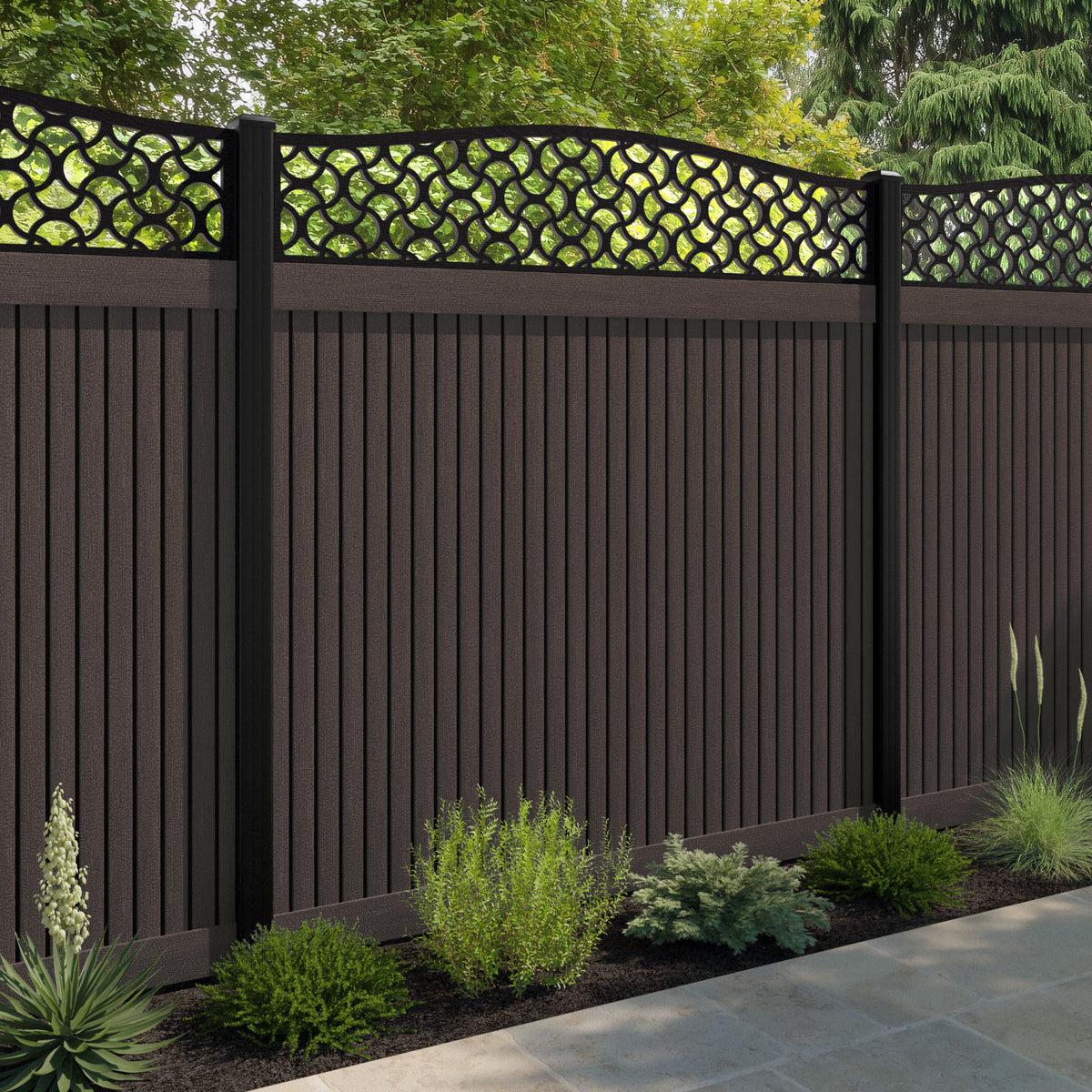 Virtis Vida Curved Top Fence Panel Mid Brown - with our aluminium posts