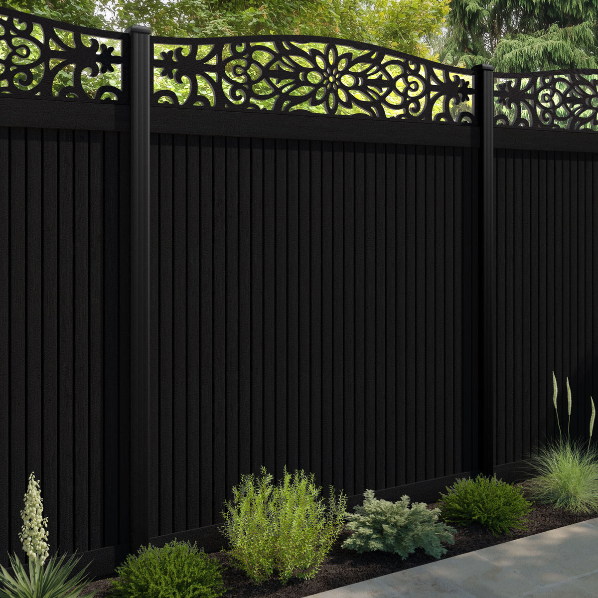 Virtis Windsor Curved Top Fence Panel Black - with our aluminium posts