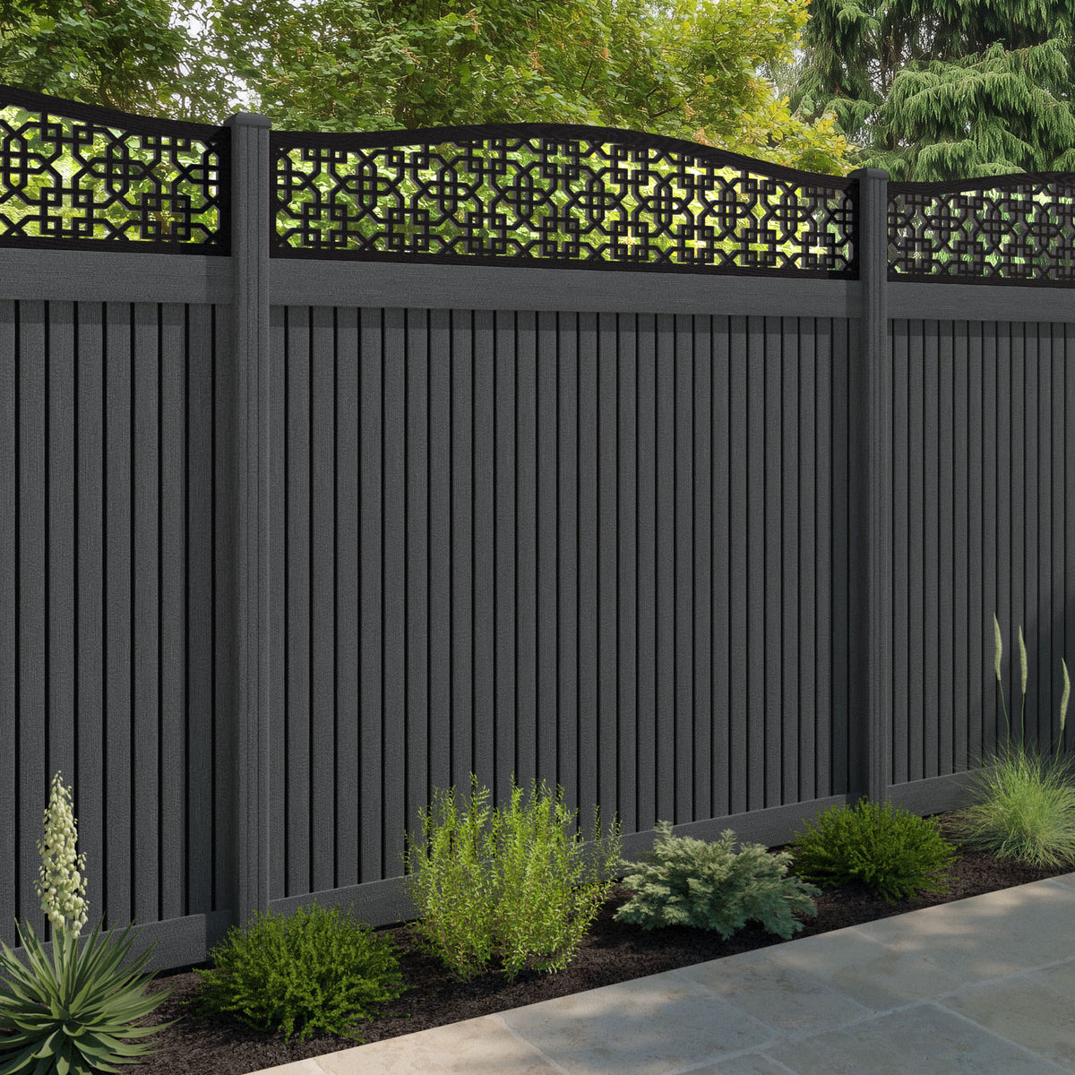Virtis Zaria Curved Top Fence Panel Dark Grey - with our composite posts