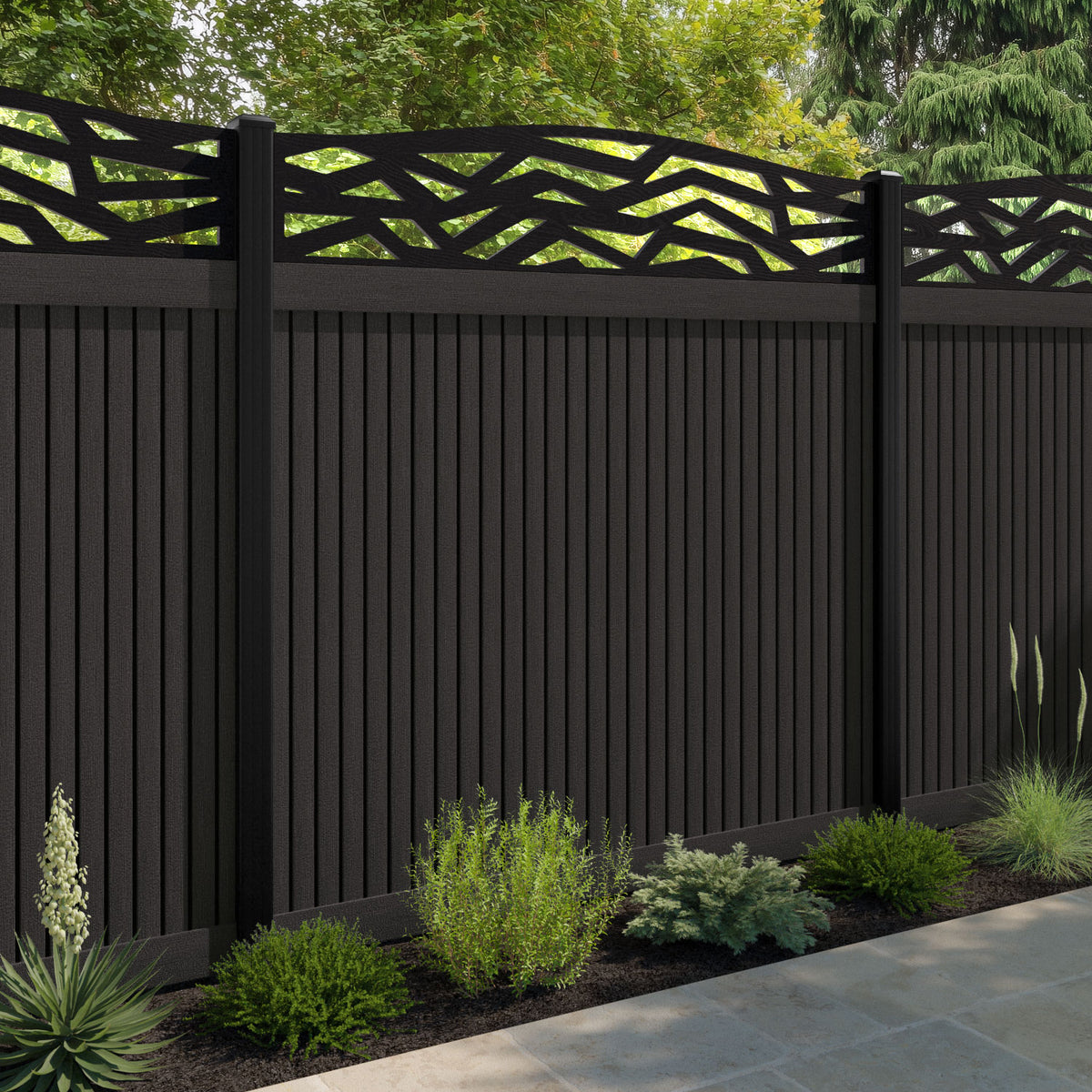 Virtis Zenith Curved Top Fence Panel Dark Oak - with our aluminium posts