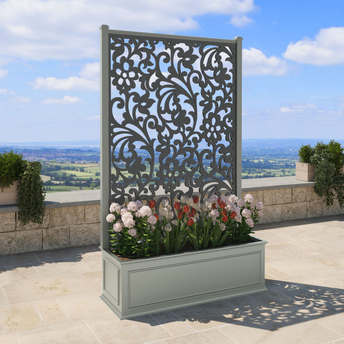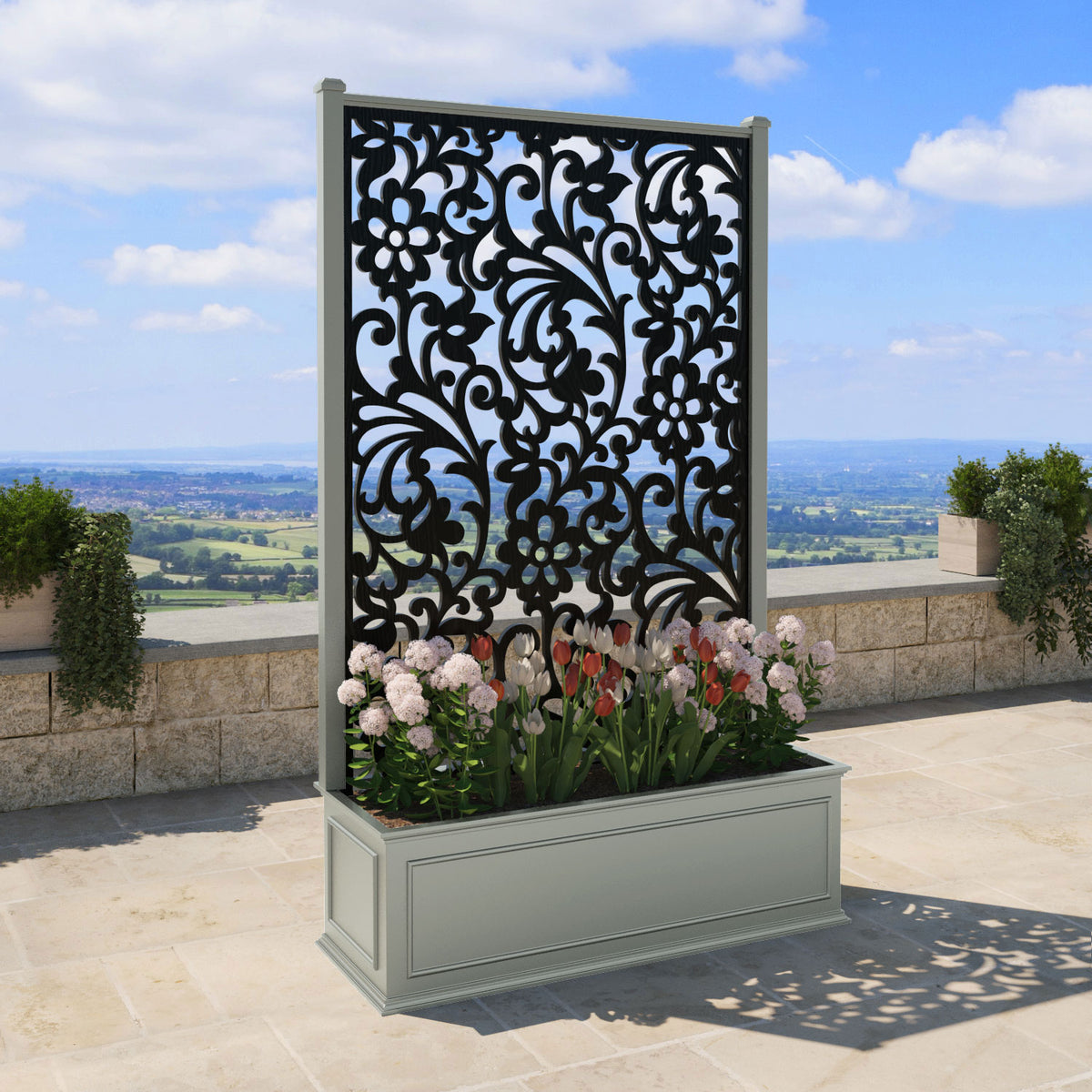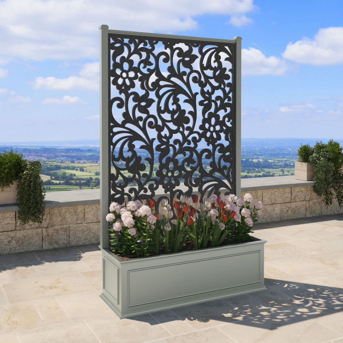 The planters are available in 6 different sizes and can be paired with any of our decorative screens that are available in 5 different colour options. The screens can be fixed at the back or in the centre of the planter. The centre option enables you to plant on both sides of the screen. They can also be ordered with a wheeled base for convenience, with lockable wheels for stability.