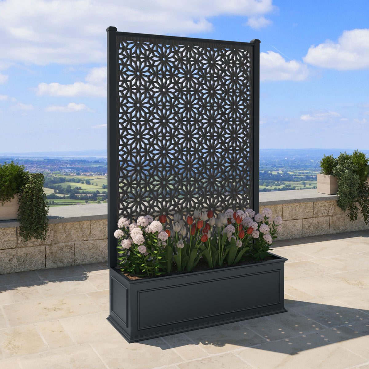 Incorporating our beautiful 18mm thick premium composite Windsor screens into our polystone trough and marine-grade aluminium planter frame to provide a practical all-weather planting and elegant partition solution.