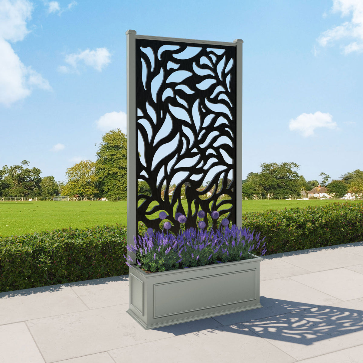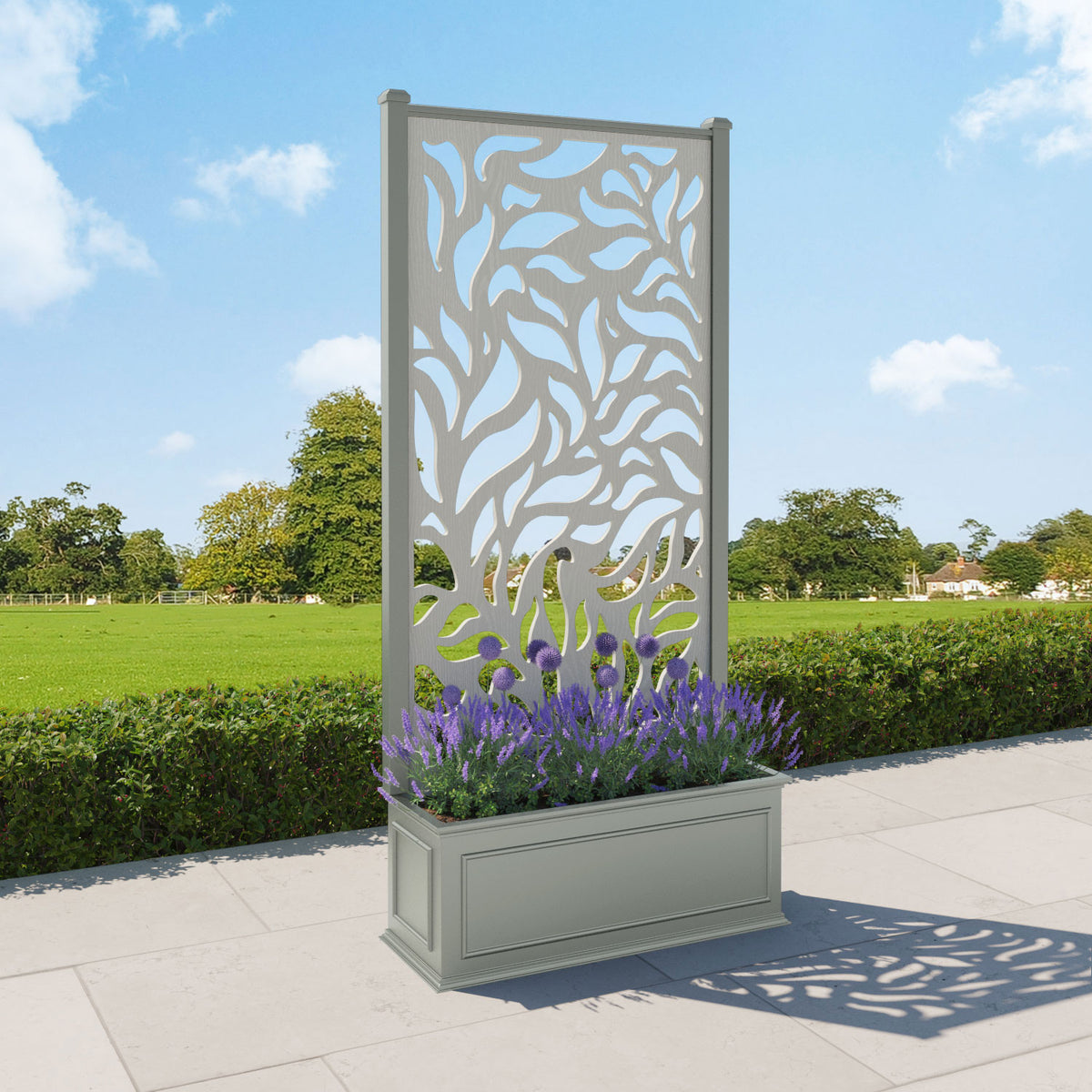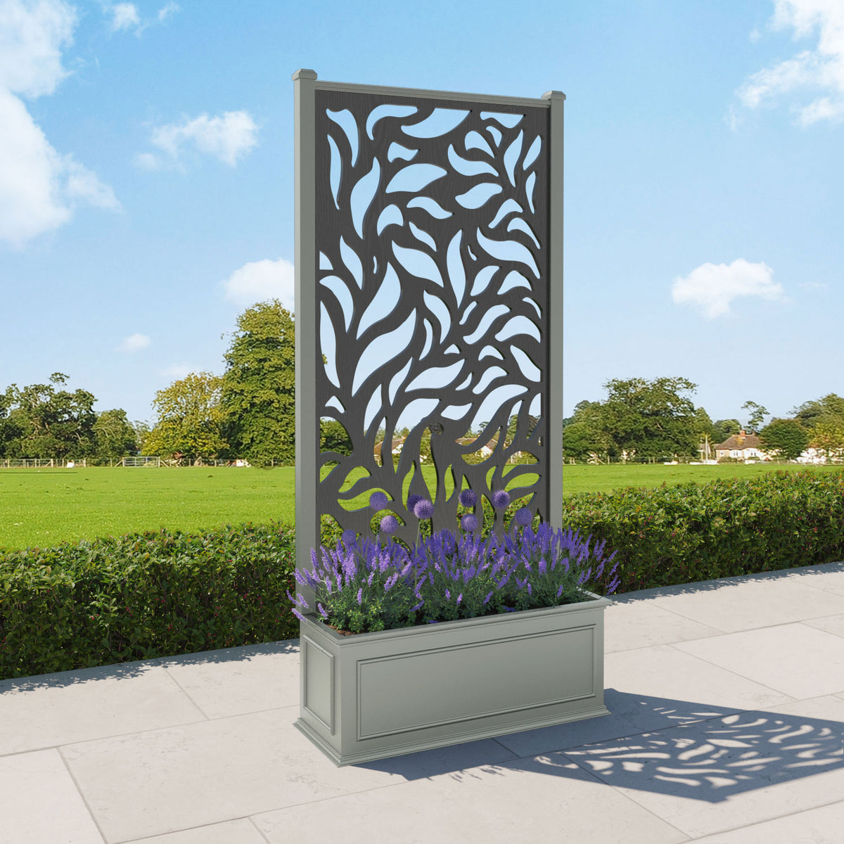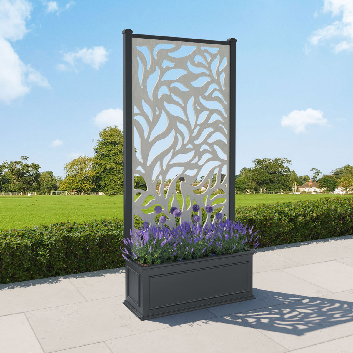 The planters are available in 6 different sizes and can be paired with any of our decorative screens that are available in 5 different colour options. The screens can be fixed at the back or in the centre of the planter. The centre option enables you to plant on both sides of the screen. They can also be ordered with a wheeled base for convenience, with lockable wheels for stability.