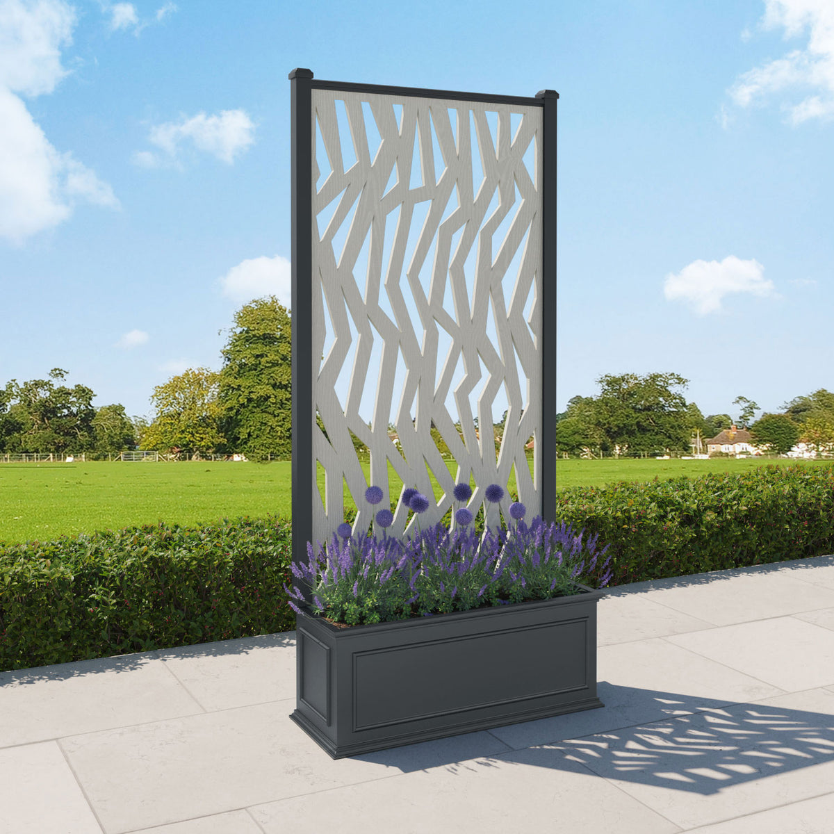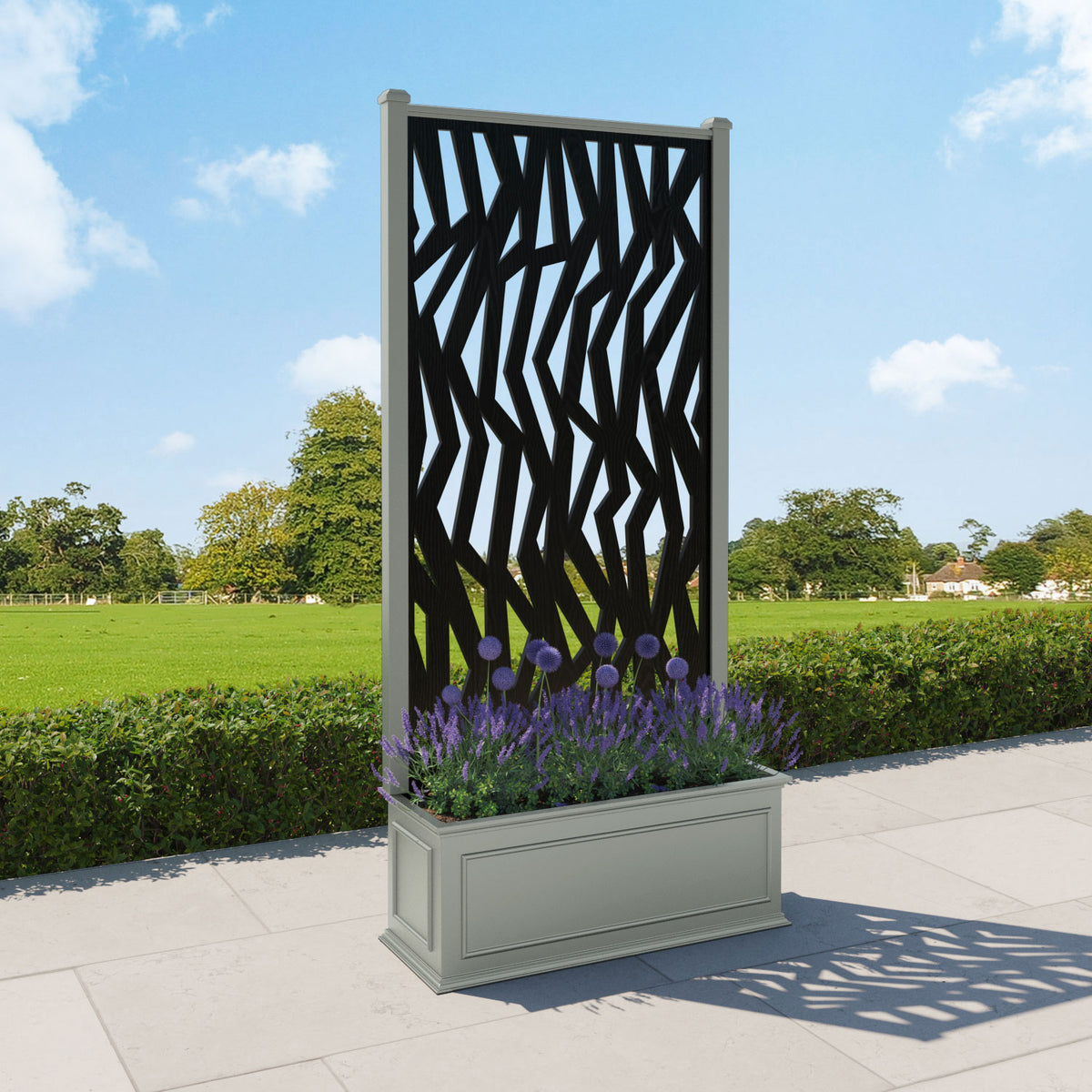 Incorporating our beautiful 18mm thick premium composite Windsor screens into our polystone trough and marine-grade aluminium planter frame to provide a practical all-weather planting and elegant partition solution.
